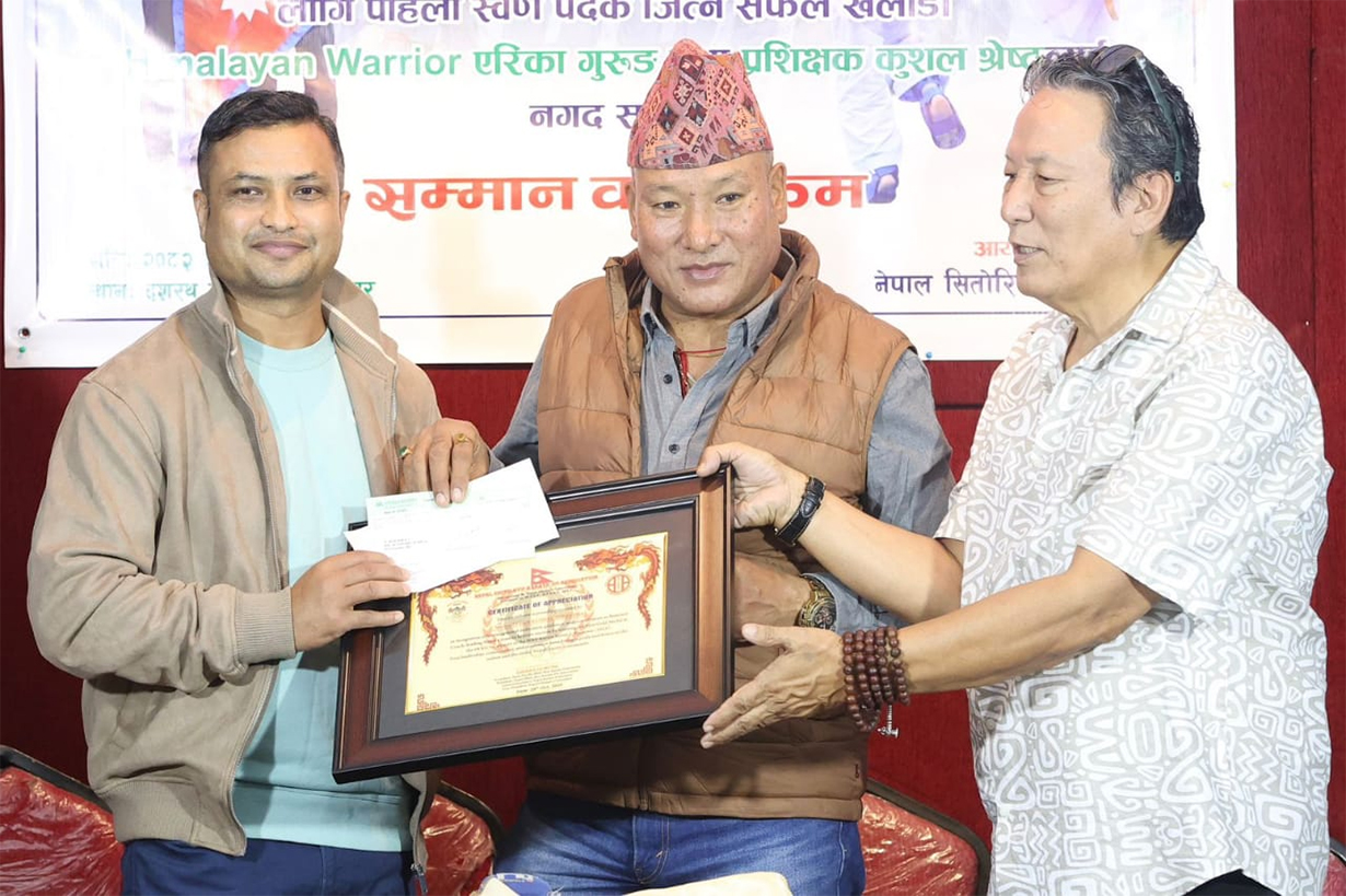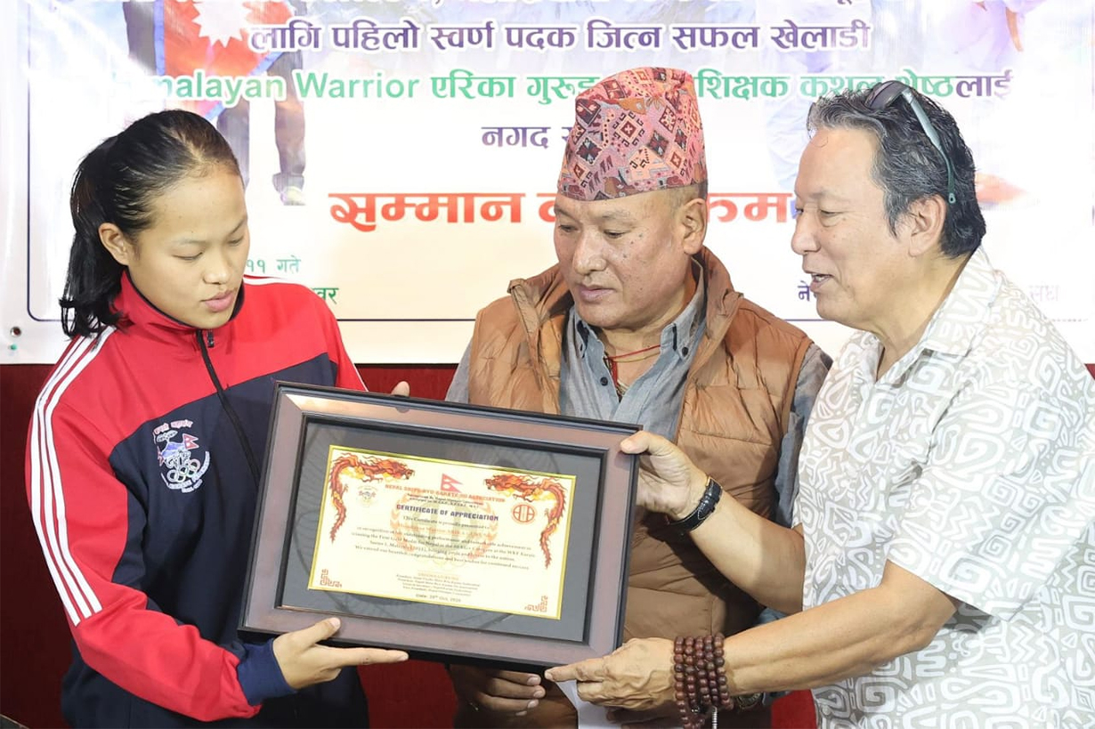 Generated by OK AI. Editorially reviewed.- नेपाली करातेकी स्टार एरिका गुरुङ र प्रशिक्षक कुशल श्रेष्ठ नगदसहित सम्मानित भएका छन् ।