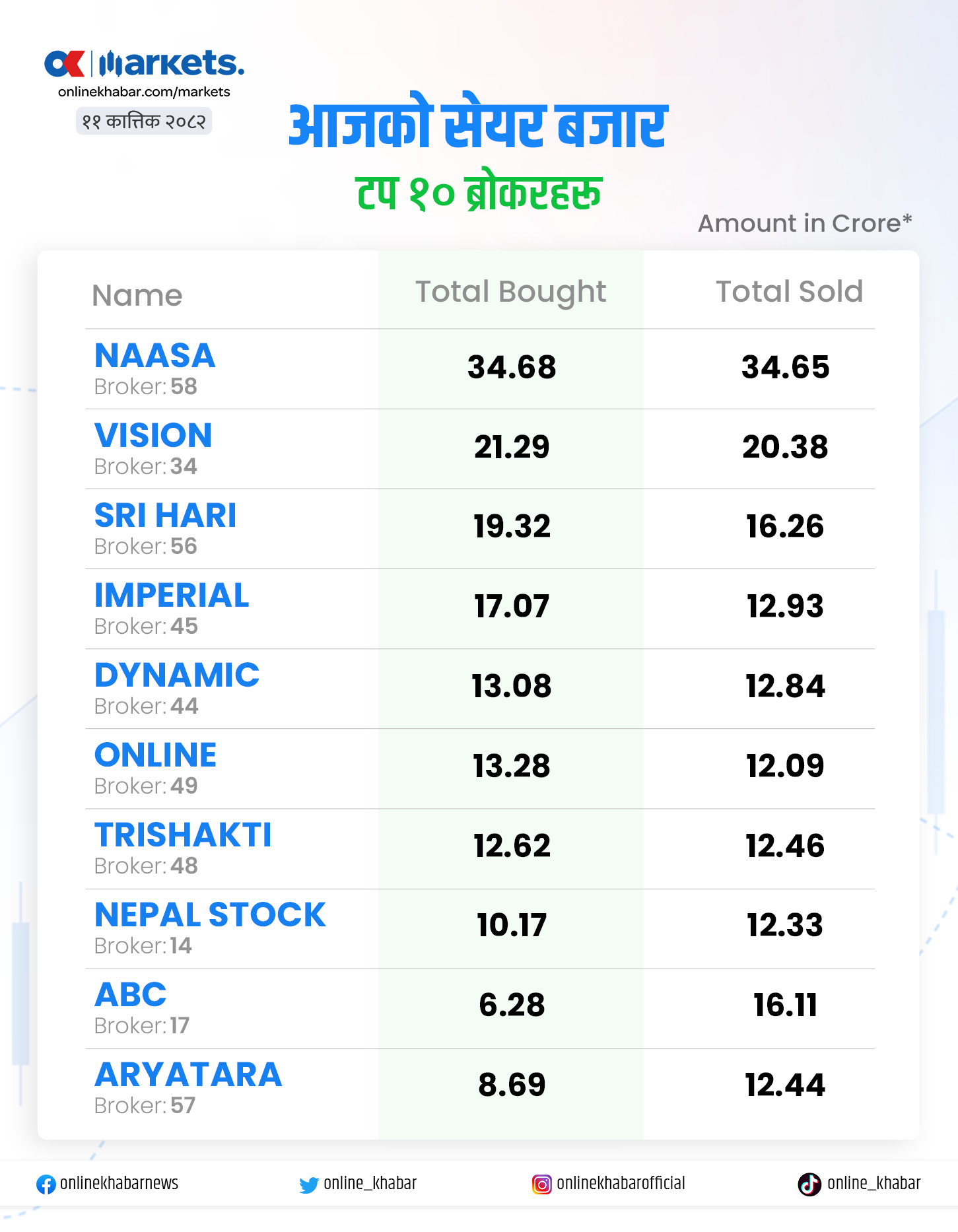 नासा, भिजन, श्रीहरि, इम्पेरियल, डायनामिक, अनलाइन, त्रिशक्तिमार्फत खरिद बढी देखिएको छ । त्यस्तै नेपाल स्टक, एबीसी र आर्यतारामार्फत बिक्री बढी देखिएको छ ।