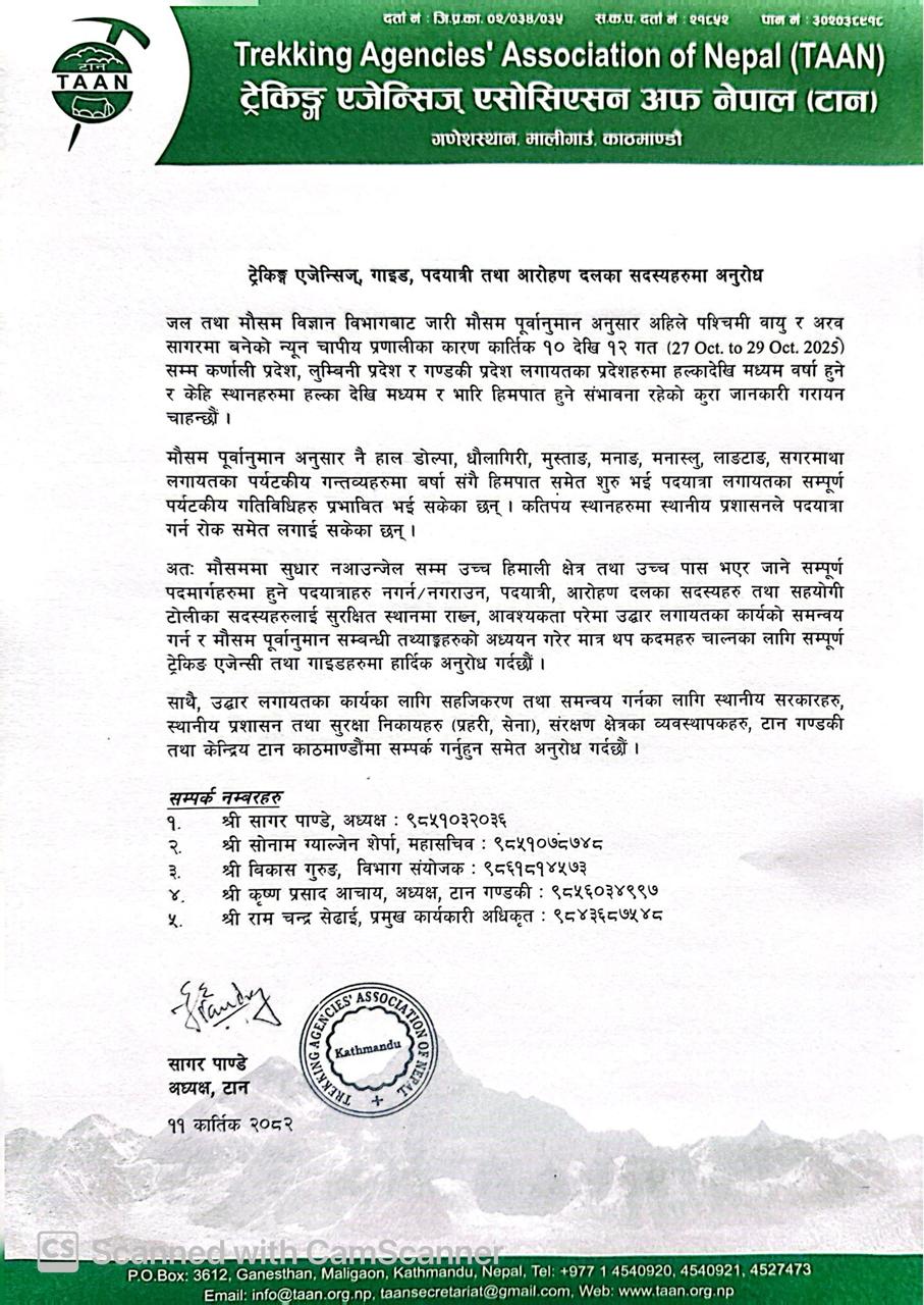 टानका अध्यक्ष सागर पाण्डेले आज एक विज्ञप्ति जारी गरी जल तथा मौसम विज्ञान विभागबाट जारी मौसम पूर्वानुमान अनुसार अहिले पश्चिमी वायु र अरव सागरमा बनेको न्यूनचापीय प्रणालीका कारण कात्तिक १० देखि १२ गतेसम्म कर्णाली, लुम्बिनी र गण्डकीलगायतका प्रदेशमा हल्कादेखि मध्यम वर्षा भएकाले हिमाली क्षेत्रको यात्रामा ध्यान दिन आग्रह गरेका हुन् ।