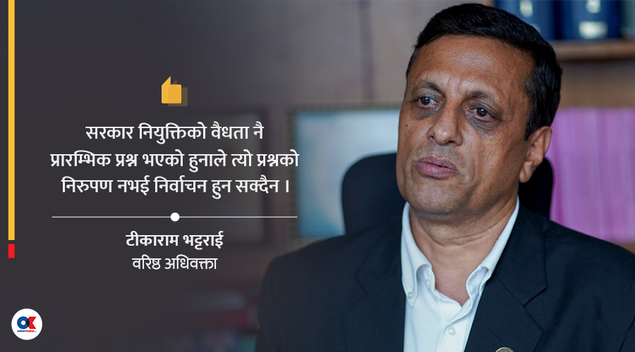 यी विषयमा अन्तरिम आदेश भएको अवस्थामा सरकारलाई एउटा गाइडलाइन हुने उल्लेख गर्दै भट्टराईले थपे, ‘सरकार नियुक्तिको वैधताको प्रश्न नै प्रारम्भिक प्रश्न भएको हुनाले त्यो प्रश्नको निरुपण नभई चुनाव हुन सक्दैन ।’