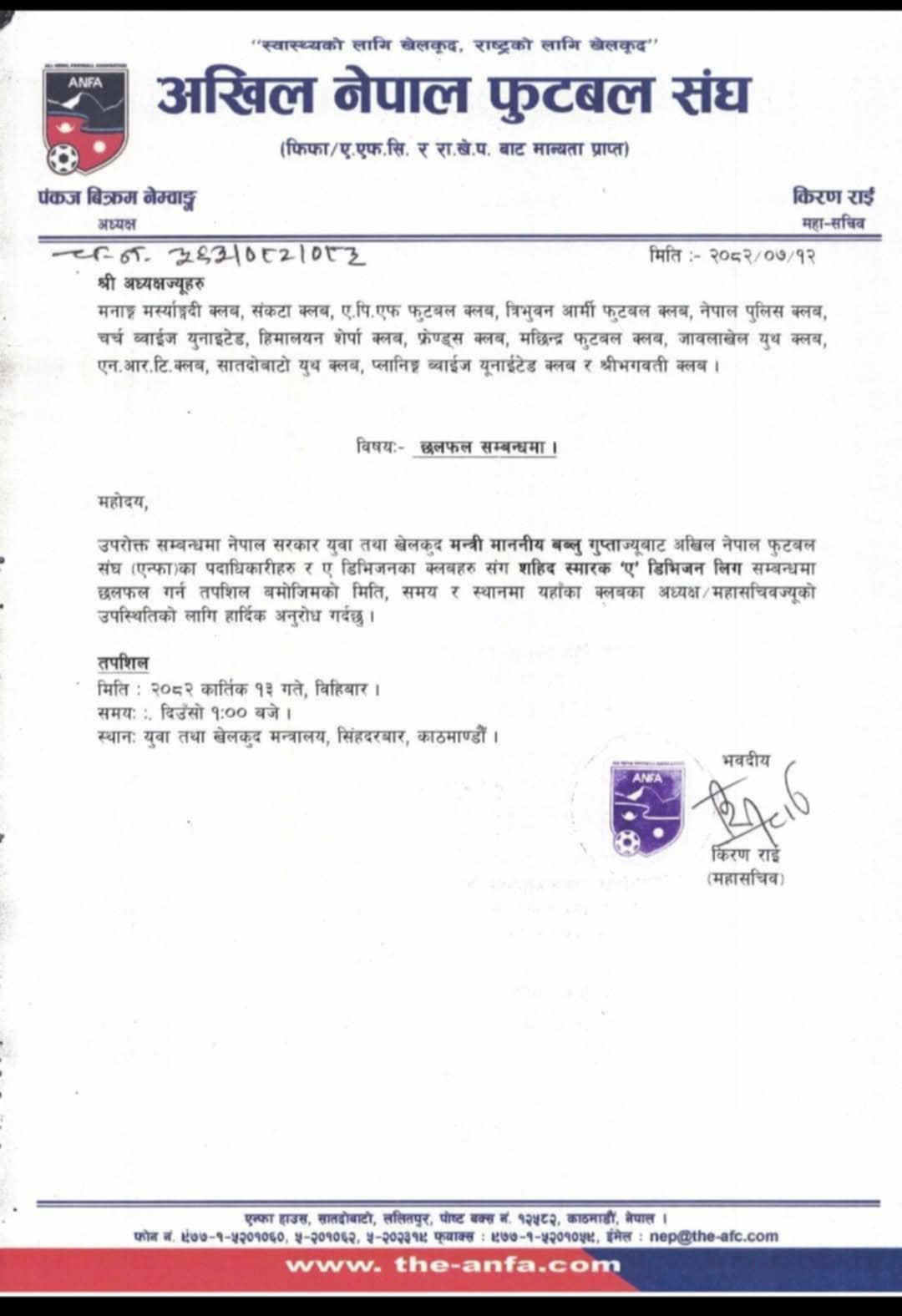 एन्फाले मन्त्री गुप्ताबाट एन्फा पदाधिकारी र ए डिभिजन क्लबहरुसँग शहीद स्मारक ए डिभिजन लिग सम्बन्धमा बिहीबार छलफल गर्ने कार्यक्रम रहेको भन्दै १४ वटै क्लबलाई पत्र पठाएर जानकारी गराएको छ ।