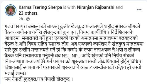 एन्फाका पूर्व अध्यक्ष कर्मा छिरिङ शेर्पाले लिगको विषयमा मन्त्रालयमा क्लबहरुसँग छलफल गर्ने विषयमा व्यङ्ग्य गर्दै लिग मन्त्रालयले गर्ने कि क्लबले गर्ने भनेर प्रश्न सोधेका छन् । उनले एन्फा नालायक भएर लिगको बैठक मन्त्रालयमा गर्न लागेको हो भनेर प्रश्न गरेका छन् ।