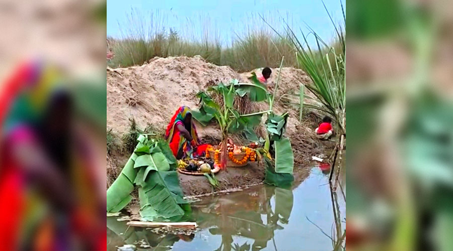 तस्वीरमा घुंघट ओढेकी एक महिला छठका सामग्रीसहित नदी किनारमा बसिरहेकी छिन् । वरिपरि दुई बालबालिका खेलिरहेका देखिन्छन् । तस्वीरले उनी विपन्न पृष्ठभूमिकी हुन् भन्ने झल्को दिलाउँछ ।