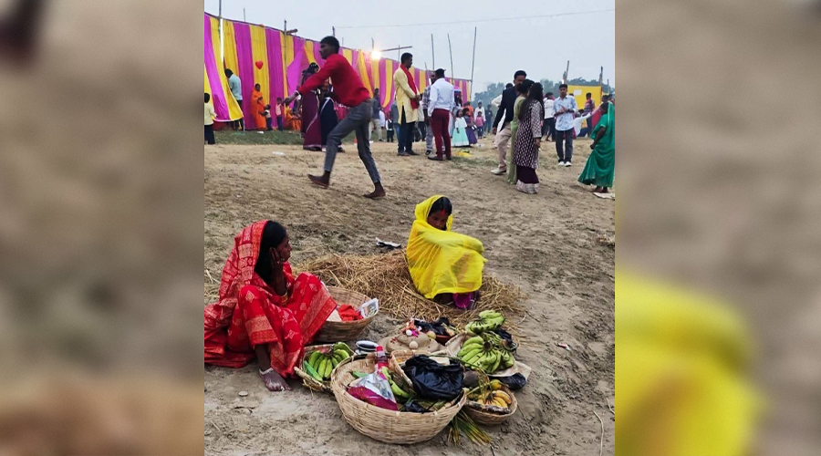 - दोस्रो तस्वीरमा डोम समुदायका महिलालाई जातीय छुवाछुतका कारण सामूहिक पण्डालमा छठ गर्न नदिएको र उनीहरूले अलग्गै छठ मनाएको देखिन्छ।
