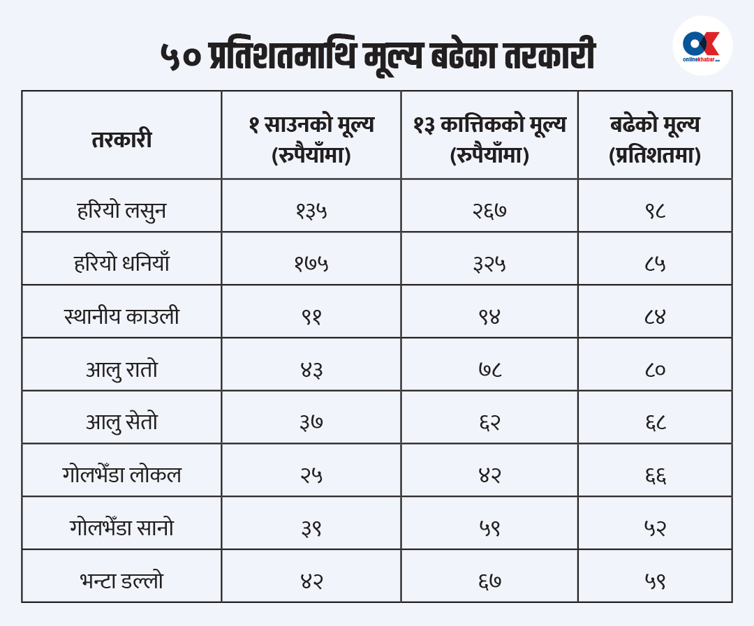 कालीमाटी फलफूल तथा तरकारी बजार विकास समितिको तथ्यांकले साउनदेखि नै अधिकांश तरकारीको भाउ होलसेलमा नै उल्लेख्य वृद्धि भएको देखाउँछ ।