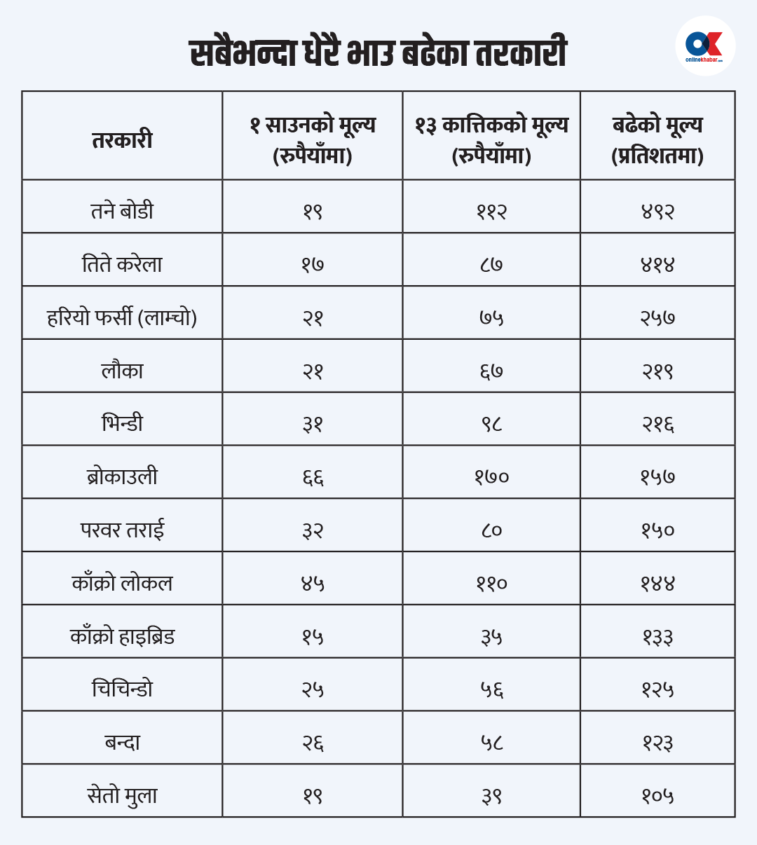 १ साउनमा हरियो फर्सीको भाउ २१ रुपैयाँ थियो । अहिले ७५ रुपैयाँ कायम छ । चिचिन्डो साउनमा किलोको २५ रुपैयाँमा किनबेच भएकामा आजसम्म आइपुग्दा १ सय २५ प्रतिशतले बढेर ५६ रुपैयाँ पुगेको छ । ४ महिना अवधिमा ब्रोकाउलीको भाउ १ सय ५७ प्रतिशत बढेको छ ।