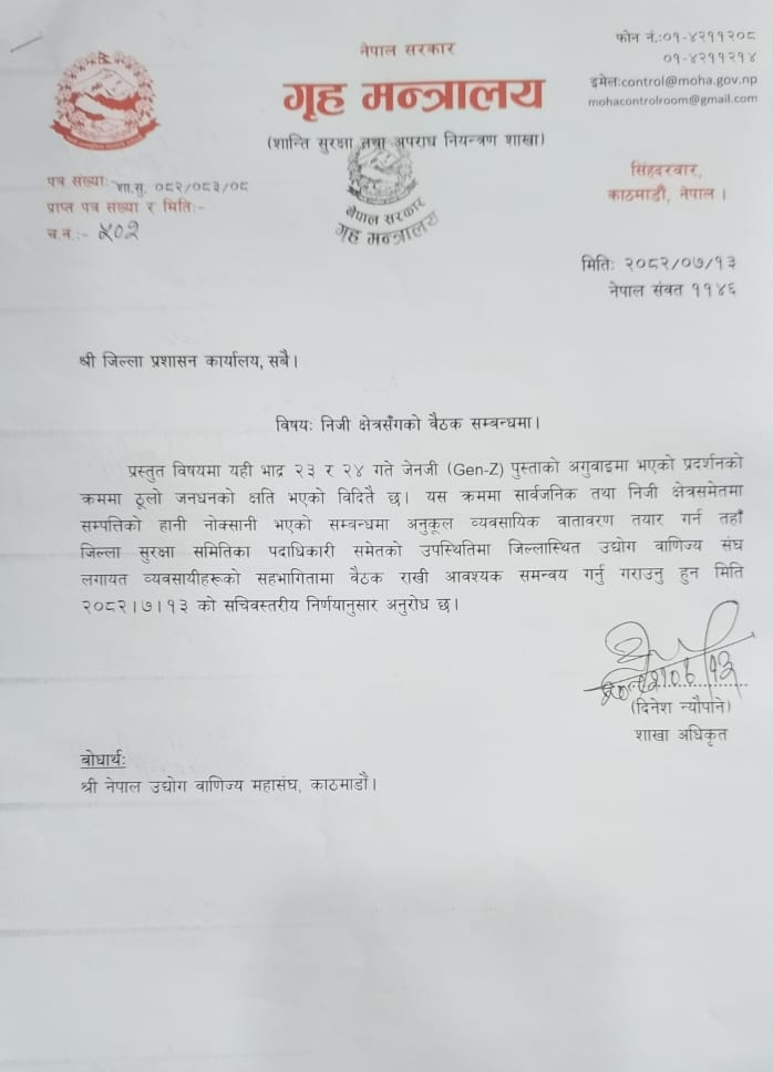 गृह मन्त्रालयको शान्ति सुरक्षा तथा अपराध नियन्त्रण शाखाले बिहीबार एक पत्र जारी गरी जेनजी प्रदर्शनका क्रममा मानवीयसँगै सार्वजिनक र निजी क्षेत्रको सम्पत्ति हानी नोक्सानी भएकोबारे जिल्ला सुरक्षा समितिका पदाधिकारीसमेत सहभागी हुनेगरी  जिल्ला उद्योग वाणिज्य संघ लगायतसँग बैठक गरेर समन्वय गर्न निर्देशन दिएको छ ।