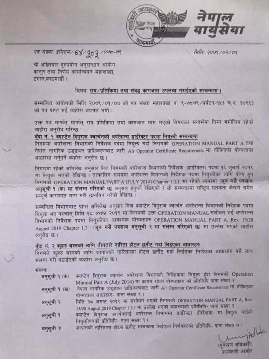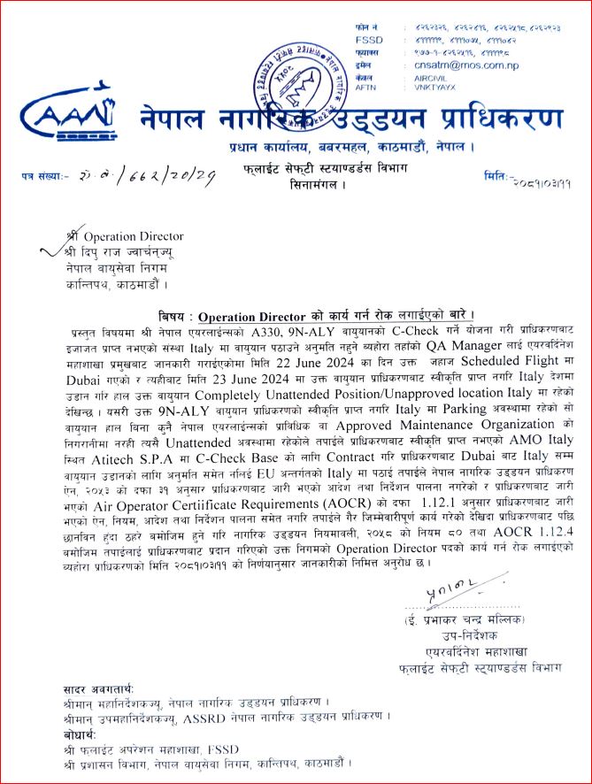 प्राधिकरणले ११ असार २०८१ मा नागरिक उड्डयन नियमावली २०५८ को नियम ८० र एयर अपरेटर सर्टिफिकेट रिक्वायरमेन्ट (एओसीआर) १.१२.४ बमोजिम अपरेसन डाइरेक्टर पदबाटै बर्खास्त गरिदिएको थियो ।