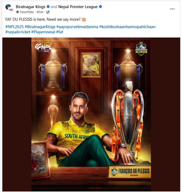 - विराटनगर किङ्सले सामाजिक सञ्जालमार्फत फाफ डुप्लेसी अनुबन्ध भएको जानकारी दिएको हो।