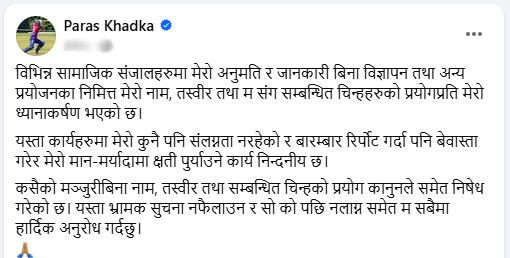 विभिन्न सामाजिक सञ्जालमा विज्ञापन तथा अन्य प्रयोजनका लागि उनको नाम, तस्वीर र चिन्हहरू उनको अनुमति र जानकारीबिना प्रयोग भइरहेको जनाउँदै पारसले ती गतिविधिमा आफू कुनै पनि रूपमा संलग्न नभएको स्पष्ट गरेका छन्।
