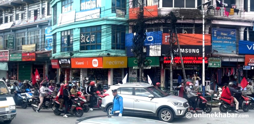 कार्यकर्ताहरूले पार्टीका झण्डा र ब्यानर बोकेर र्याली गरेका हुन् ।