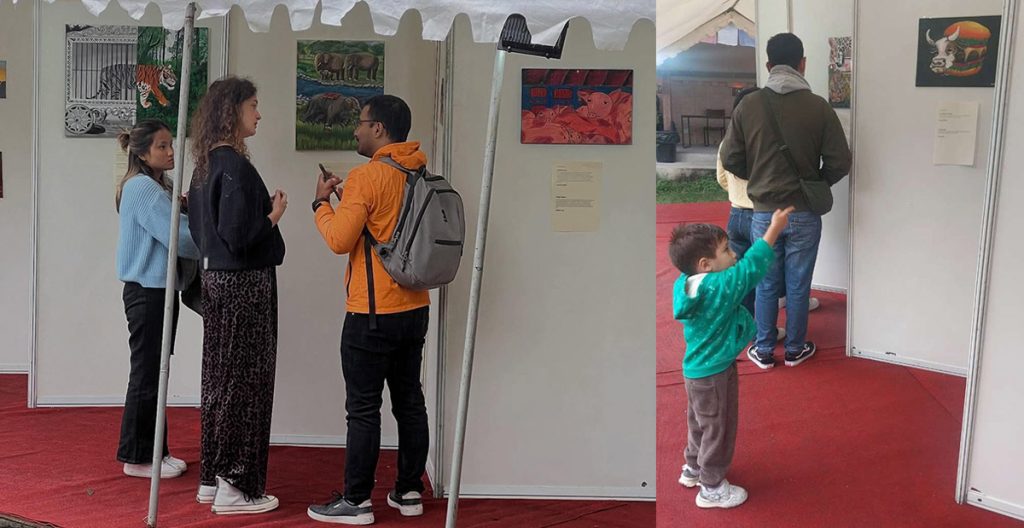 - प्रदर्शनीमा ४० भन्दा बढी कलाकृतिहरू राखिएका थिए जसले पूर्ण शाकाहार र जलवायु परिवर्तनका प्रभाव चित्रण गरेका थिए।