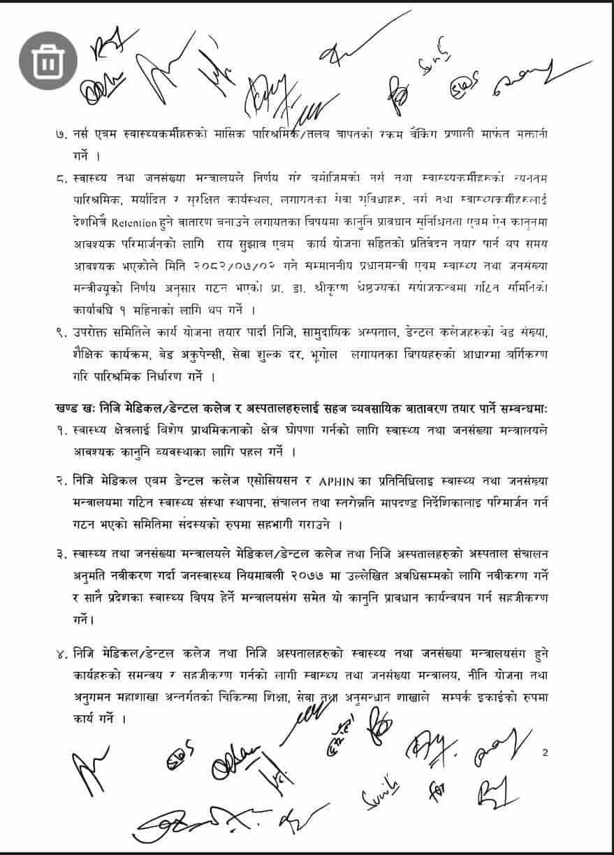 स्वास्थ्य मन्त्रालयका अनुसार शनिबार बेलुका २३ बुँदे सहमति भएको छ ।