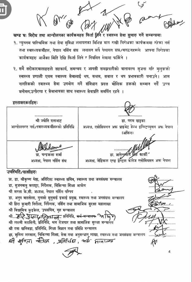 मन्त्रालयका प्रवक्ता डा. प्रकाश बुढाथोकीका अनुसार स्वास्थ्य मन्त्रालयमा नर्सहरूको माग सम्बोधन गर्न भएको वार्तामा सहमति भएको हो ।