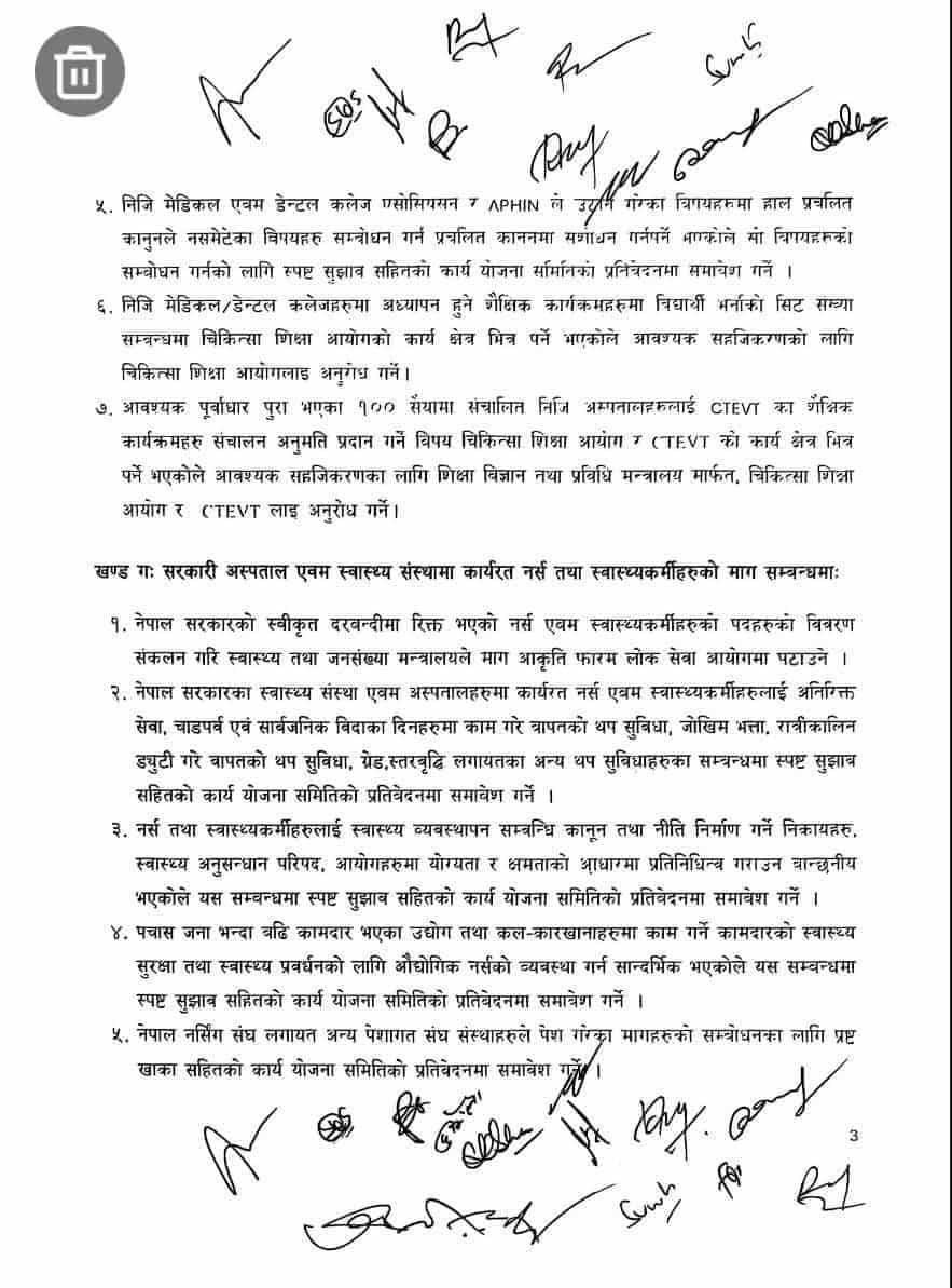 शनिबार बेलुकासम्म बसेको बैठकमा स्वास्थ्य मन्त्री डा. सुधा शर्मा, सचिव डा. विकास देवकोटा, कार्यदल संयोजक डा. श्रीकृष्ण श्रेष्ठ, प्रवक्ता डा. प्रकाश बुढाथोकी, नर्सिङ संघका अध्यक्ष र महासचिव, तथा निजी मेडिकल कलेज र अस्पतालका प्रतिनिधिहरू उपस्थित थिए ।