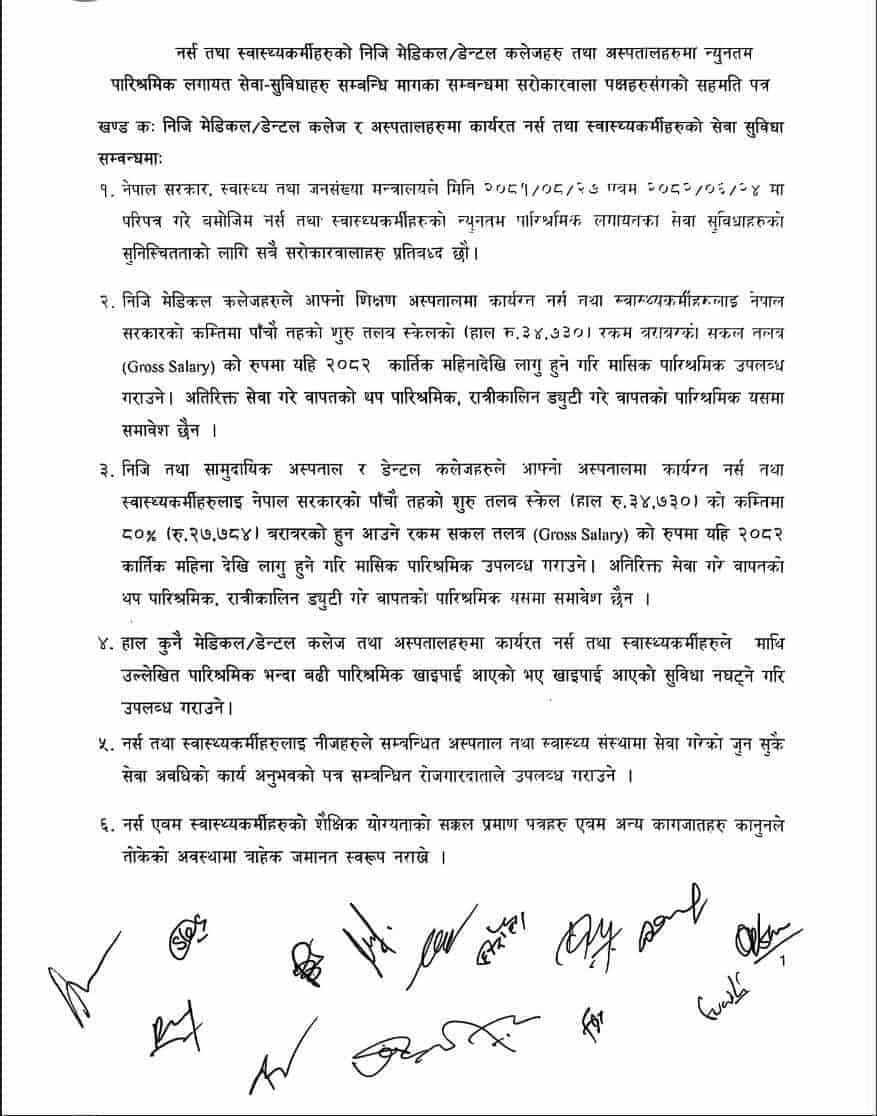 अन्य निजी अस्पतालहरूले भने हाललाई २७ हजार ७८४ तलब दिने र एक महिनाभित्र अस्पतालको वर्णीकरण गर्दै सरकारी सरह नै पुर्याउने सहमति भएको डा. बुढाथोकीले बताए ।