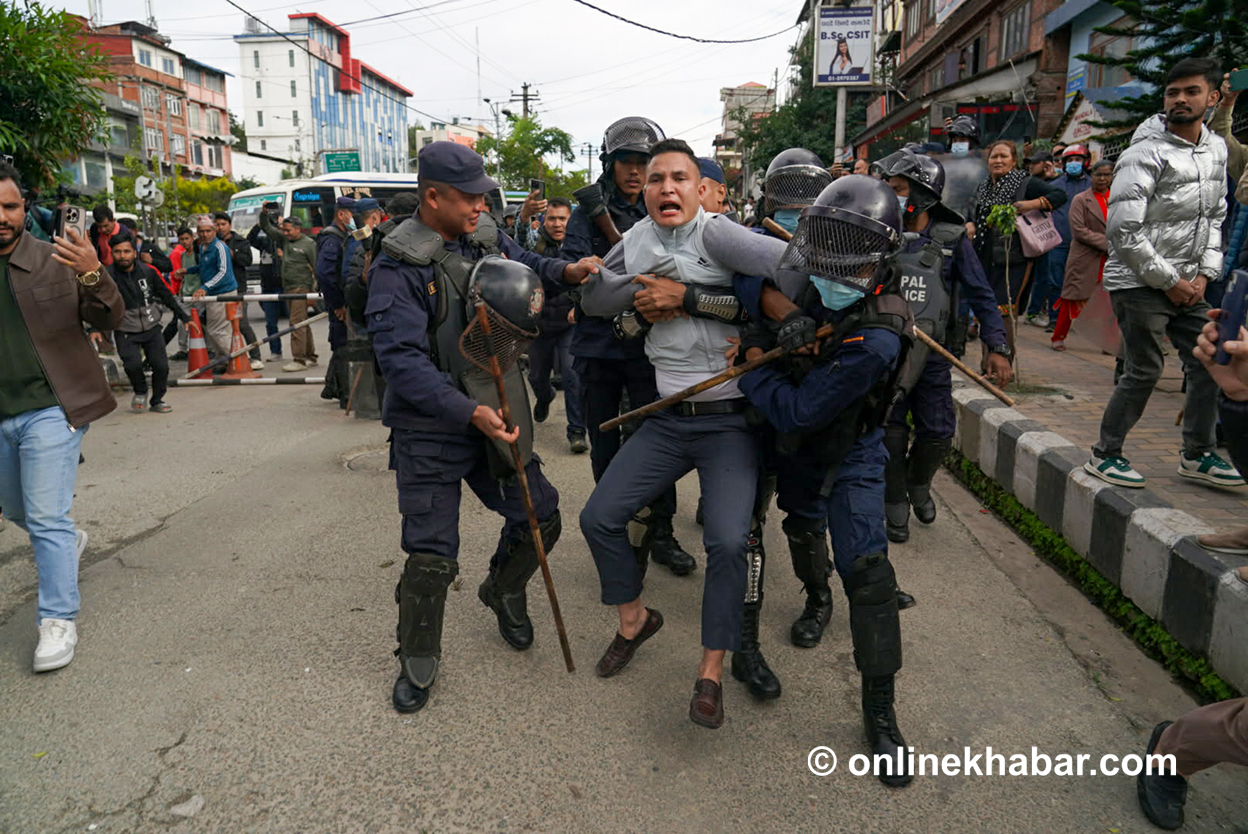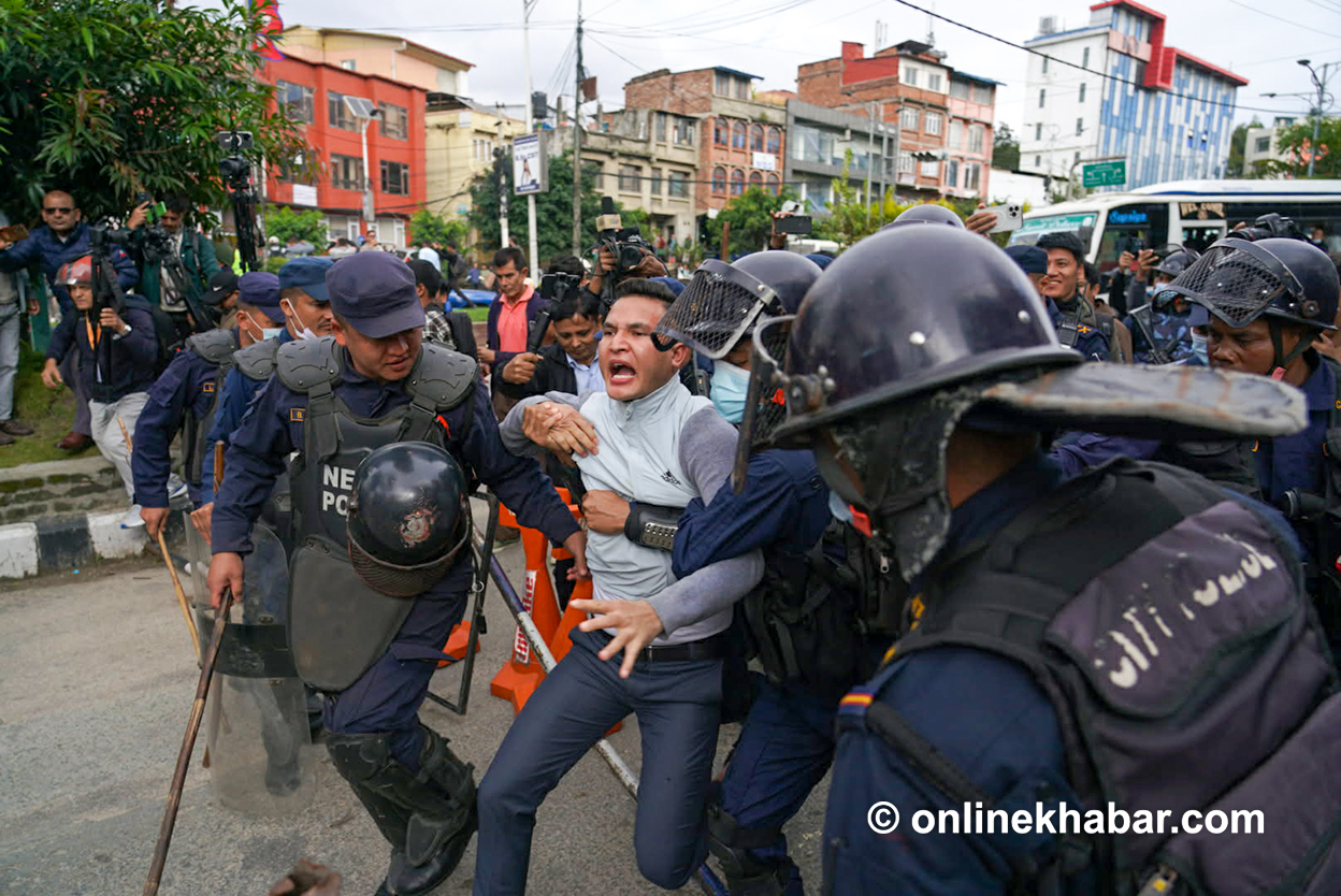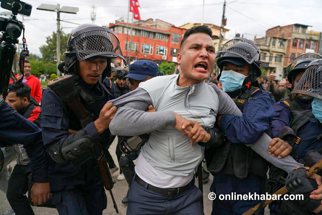 निवर्तमान प्रधानमन्त्री केपी शर्मा ओली र निवर्तमान गृहमन्त्री रमेश लेखक लगायतलाई पक्राउ गर्न माग गर्दै प्रदर्शन गर्न पुगेकाहरूलाई प्रहरीले नियन्त्रणमा लिएको हो ।