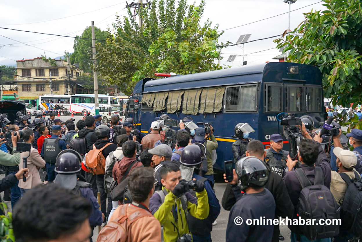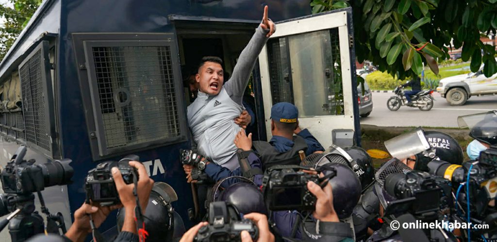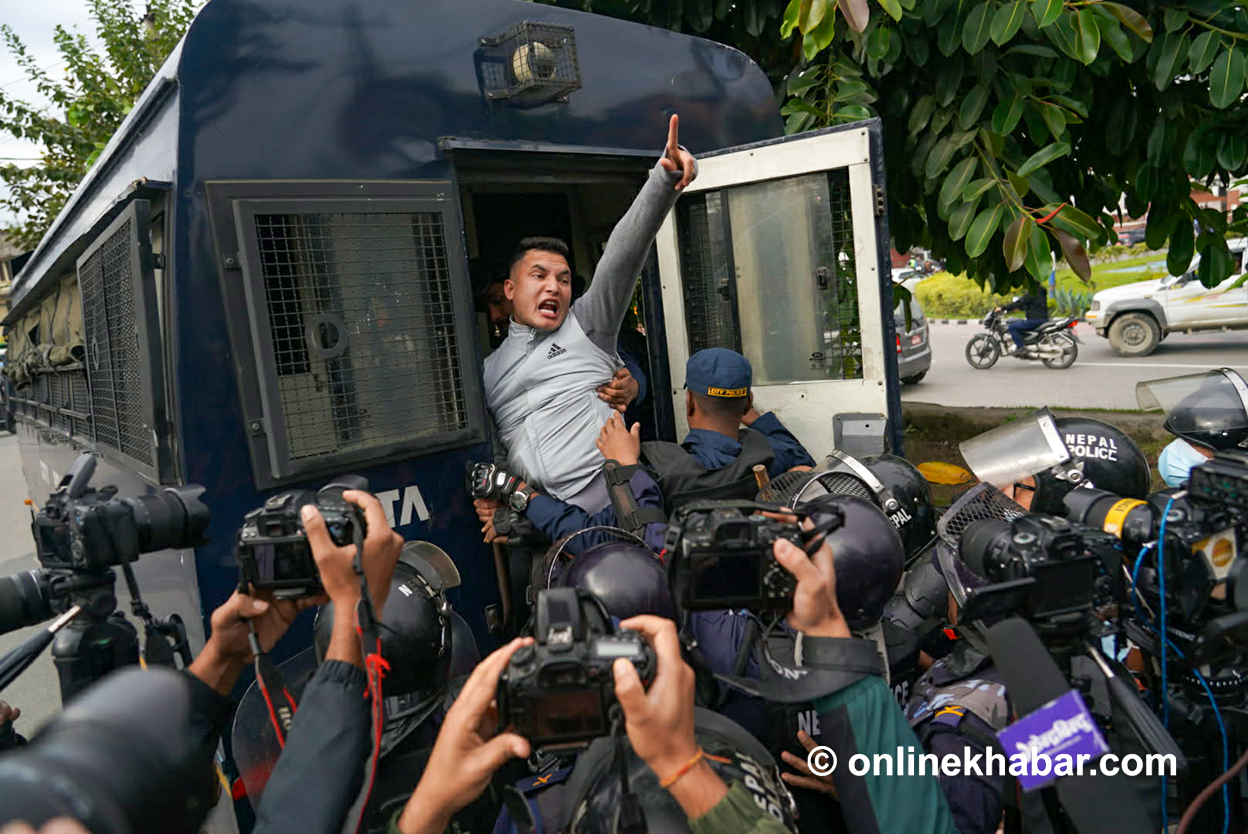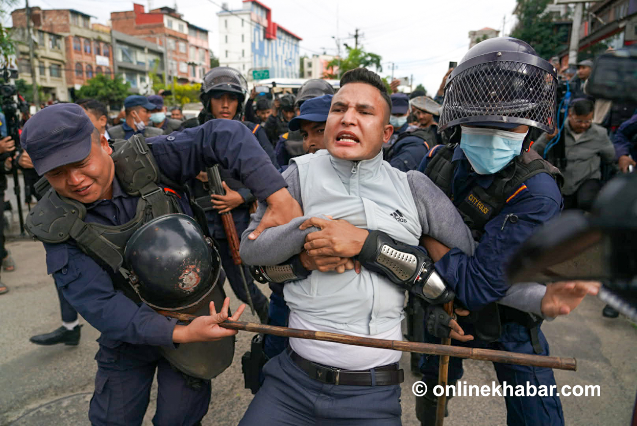 निवर्तमान प्रधानमन्त्री केपी शर्मा ओली र निवर्तमान गृहमन्त्री रमेश लेखक लगायतलाई पक्राउ गर्न माग गर्दै प्रदर्शन गर्न पुगेकाहरूलाई प्रहरीले नियन्त्रणमा लिएको हो ।