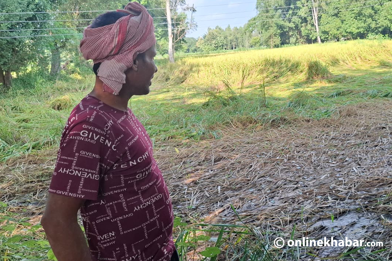 ‘हेर्नुस् हाम्रो हालत,’ दासले भिजेको धान देखाए, ‘असारमा वर्षा नहुँदा सिंचाइ गरेर रोप्यौं, खाद्यमल, मिहिनेत र लगानी गरेर जसोतसो फलायौं, तर अहिले बेमौसमी वर्षाले ५ कठ्ठाको धान सखाप बनायो । भगवान र प्रकृति पनि किसानमाथि निर्मम छ । अब वर्षभरि के खाने ?’