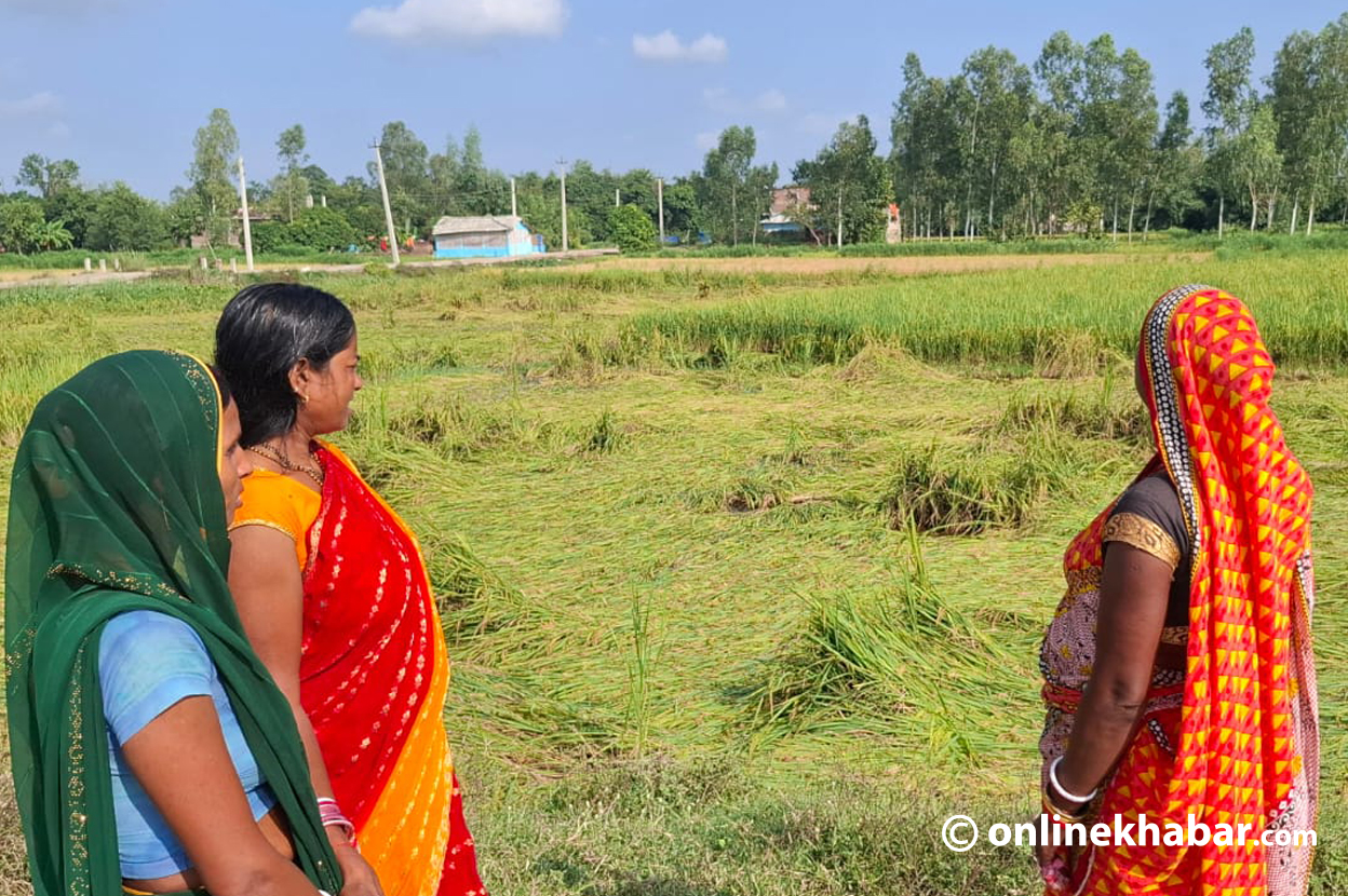 खडेरीको बेला असारमा रातभरि खेतमा धपेडी लगाएर सिंचाइ गरी उनको परिवारले एकबिघा धान रोपेको थियो । त्यसमा महँगोमै खाद्यमल किनेर हाले । मजदुर लगाए । अहिले तयार भएको धान घर भित्र्याउने बेला बेमौसमी वर्षाले खेतमै ढलेको छ । मौसमले दिएको दुःखले उनी चिन्तित छिन् ।