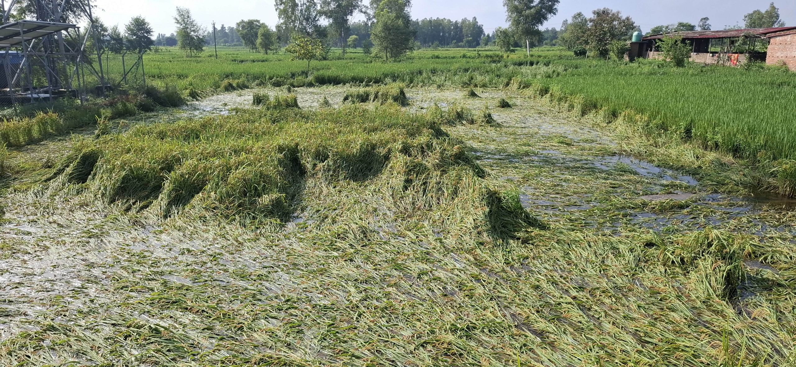 विशेषगरी मुख्य सिजनको धान भित्र्याउने बेला मंगलबारदेखि परेको अविरल वर्षा र हावाहुरीले पाकेको धान खेतमै ढलेर ठूलो नोक्सानी पुर्याएको छ । काटेको धान पानीमा डुबेर कुहिन थालेको छ भने परालको गुणस्तरमा समेत ह्रास आएको छ ।