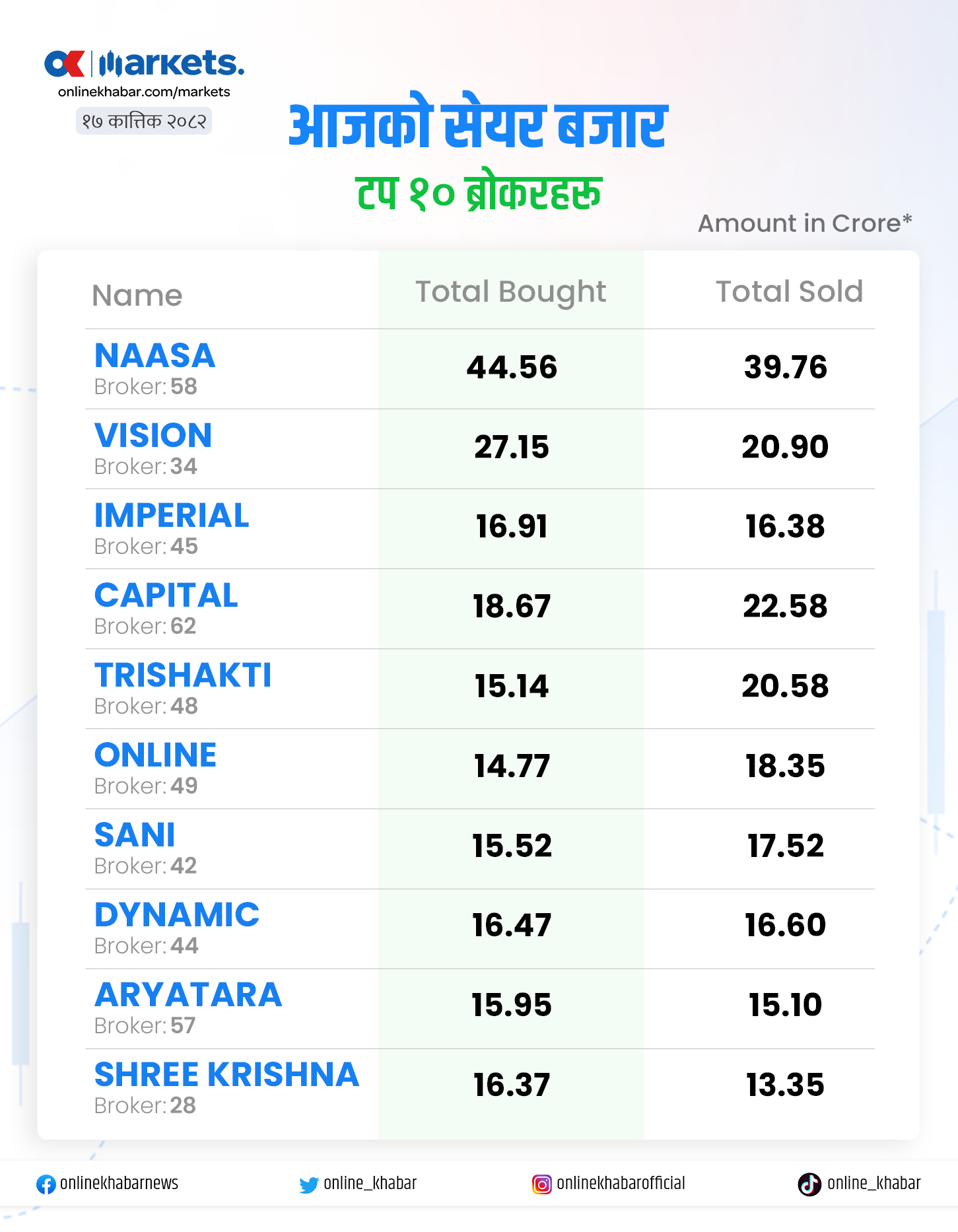 ठूला १० ब्रोकरमध्ये ५ मार्फत खरिद बढी भएको छ भने ५ मार्फत बिक्री बढी भएको छ । नासा, भिजन, इम्पेरियल, आर्यतारा र श्रीकृष्णमार्फत खरिद बढी भएको छ । त्यस्तै क्यापिटल, त्रिशक्ति, अनलाइन, सनी र डायनामिकमार्फत बिक्री बढी भएको छ ।