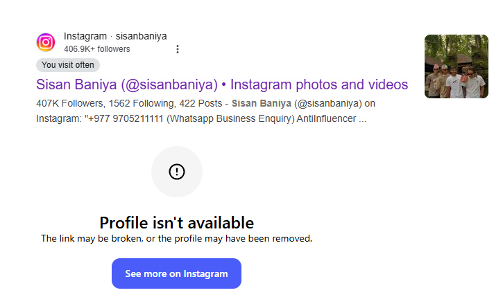 Generated by OK AI. Editorially reviewed.- चर्चित भ्लगर तथा गायक सिसन बानियाँको इन्स्टाग्राम खाता गायब भएको छ र उनको युजरनेम सर्च गर्दा ‘यो खाता अहिले उपलब्ध छैन’ देखिन्छ।
