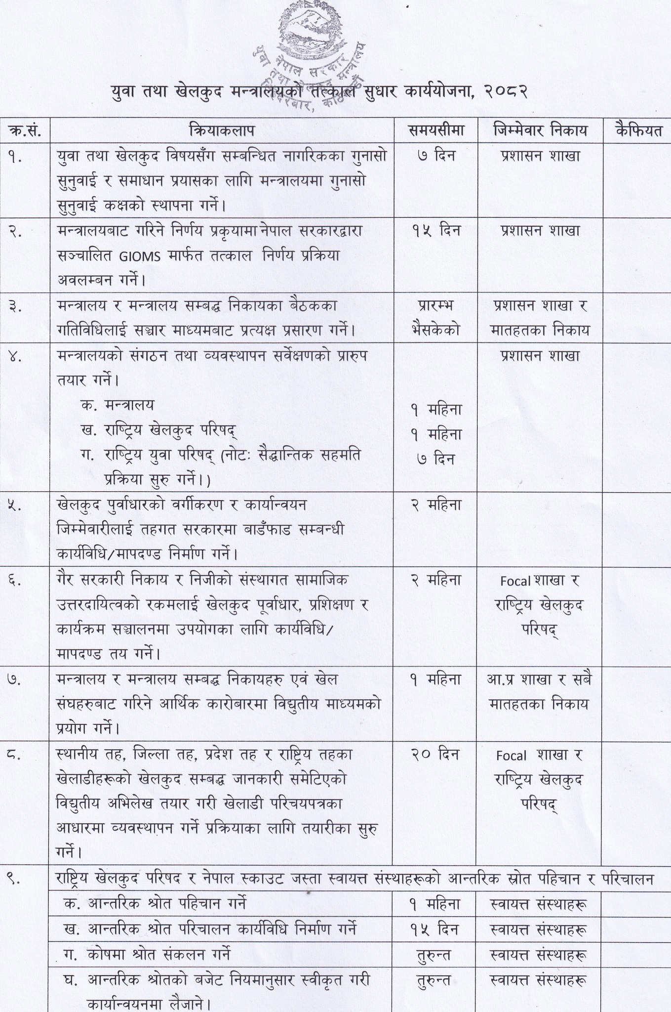 Generated by OK AI. Editorially reviewed.- युवा तथा खेलकसद मन्त्रालयले 'तत्काल सुधार कार्ययोजना २०८२' सार्वजनिक गरेको छ।