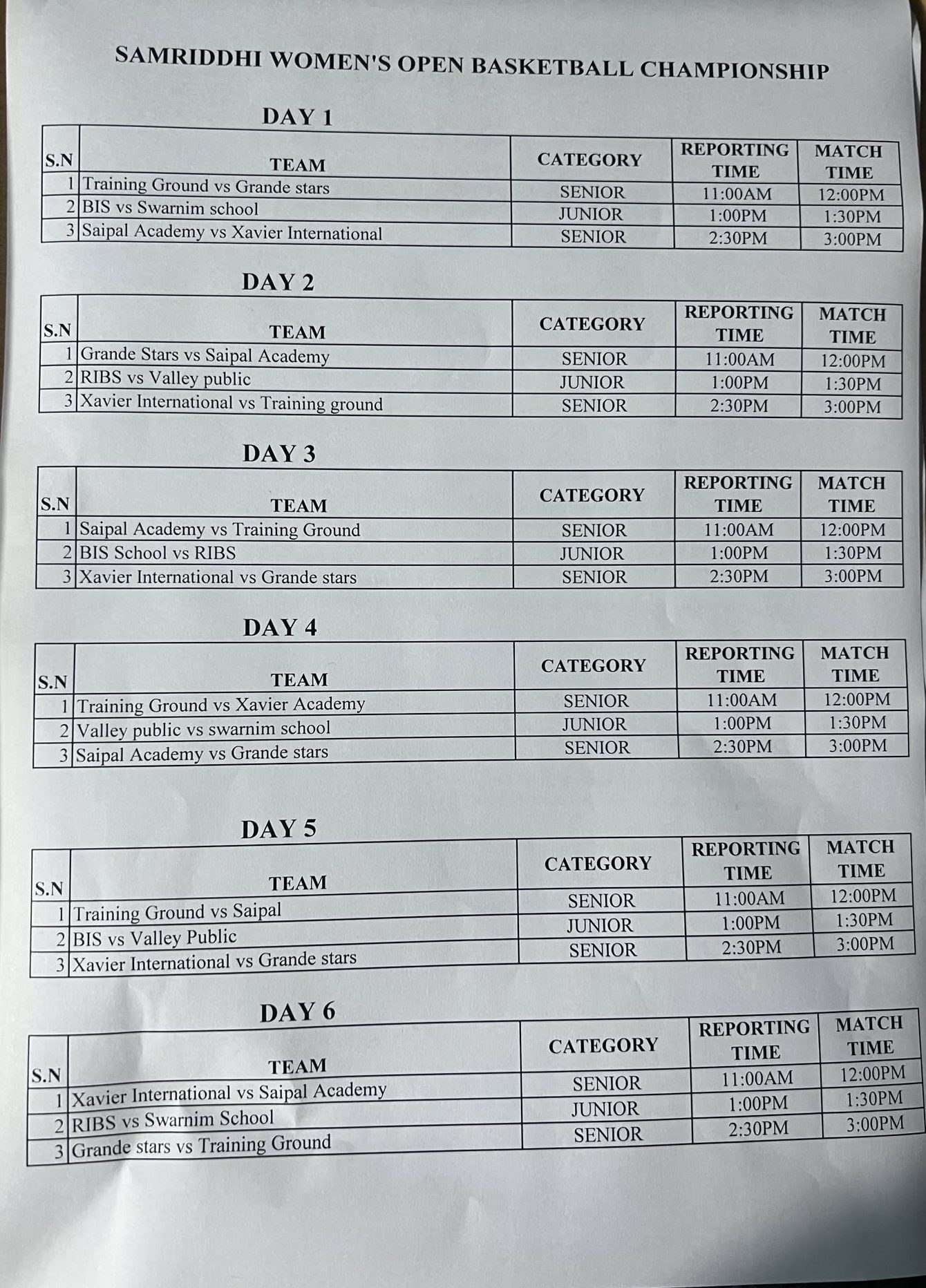 प्रतियोगिताको पहिलो दिन तीन खेल हुनेछ । जसमा सिनियरतर्फ ट्रेनिङ ग्राउण्ड र ग्रान्डे स्टार्सबीच मध्यान्न १२ बजे खेल सुरु हुनेछ । यस्तै सिनियरकै साइपाल एकेडेमी र जेभियर इन्टरनेशनलबीचको खेल दिउँसो ३ बजे हुनेछ । यस बीचमा रिब्ज र स्वार्निम स्कुलबीच दिउँसो साढे १ बजे खेल हुनेछ ।