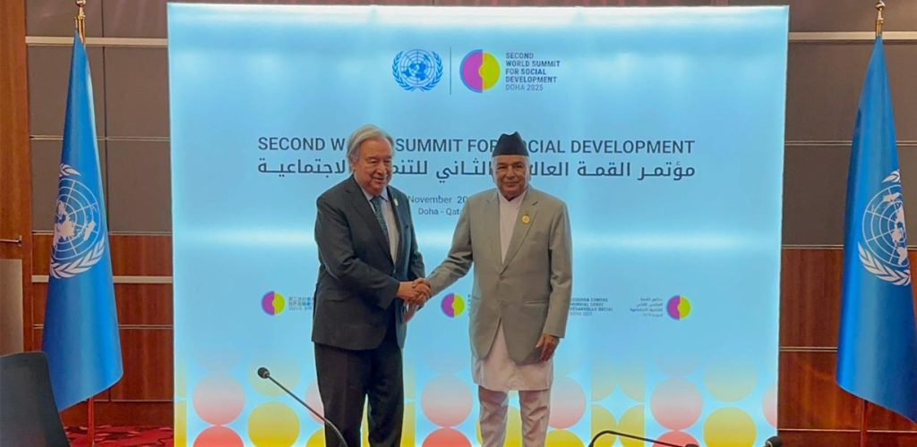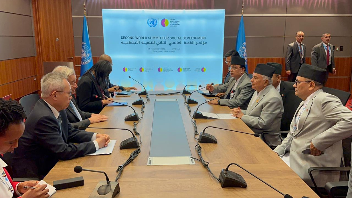 Generated by OK AI. Editorially reviewed.- राष्ट्रपति रामचन्द्र पौडेलले कतारको दोहा स्थित दोस्रो विश्व शिखर सम्मेलनमा संयुक्त राष्ट्रसङ्घका महासचिव एन्टोनियो गुटेरेससँग भेटवार्ता गरेका छन्।