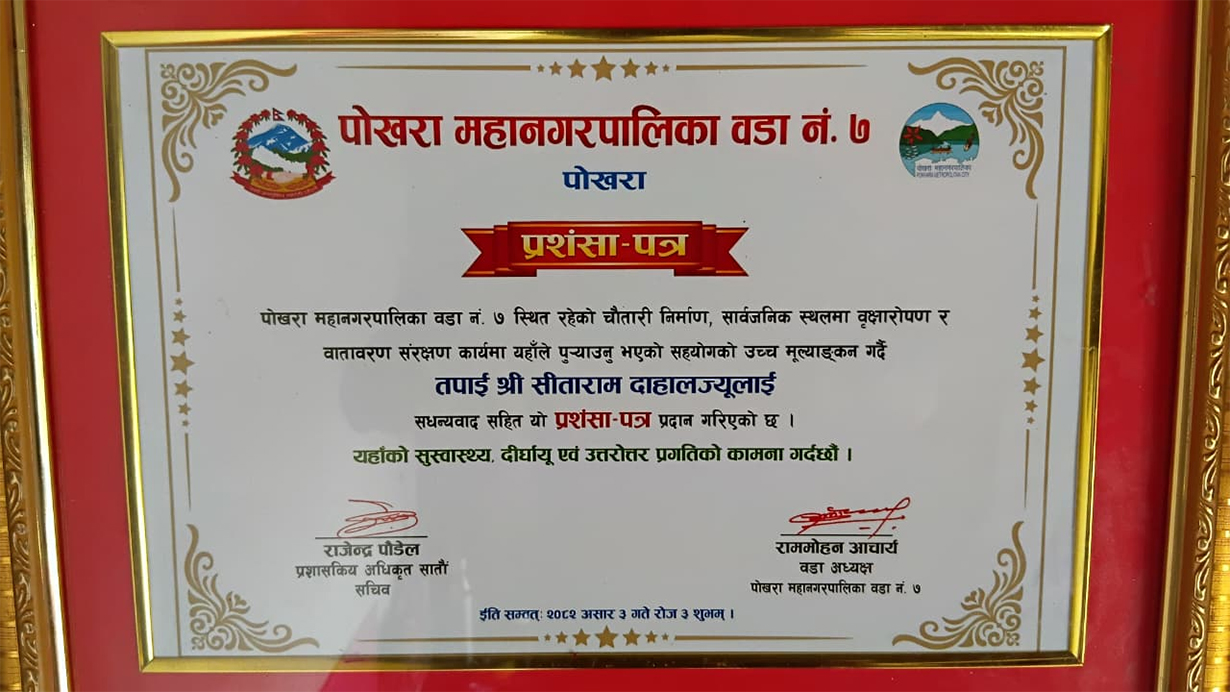 हो, यस्तै कर्ममा रमाइरहेका छन्, पोखरामा रहेका सीताराम दाहाल । पेशाले सवारी चालक दाहाल सानैदेखि वातावरण र समाजसेवामा रुचि राख्थे । बाबुबाजेले जस्तै सार्वजनिक स्थानमा बोटबिरुवा रोपेर दाहालले वातावरणमा सहयोग त पुर्याएकै छन्, समाजमै उदाहरणीय काम गर्न पनि पुगेका छन् ।