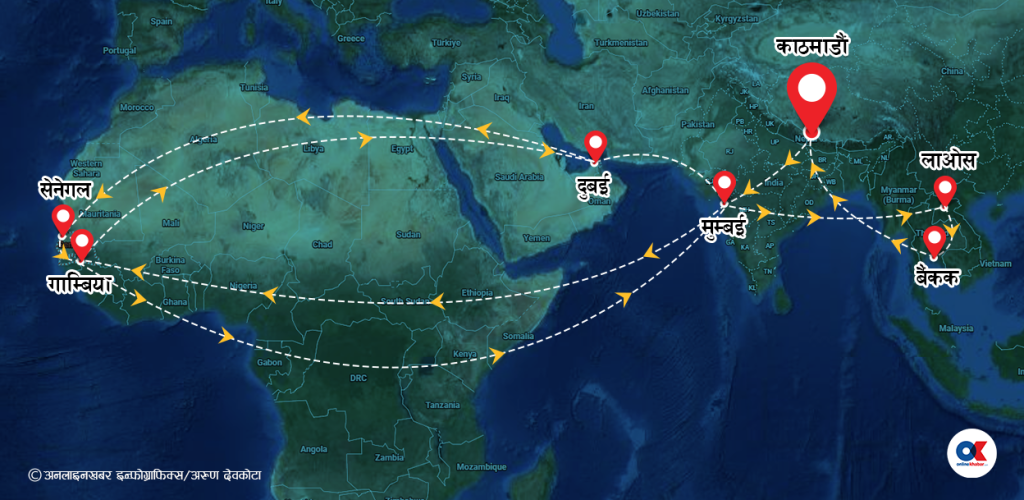 • युवतीलाई मुम्बई, गाम्बिया, दुबई, सेनेगल हुँदै लाओस पुर्‍याएर अलपत्र पारिएको र उनी आफैंले खर्च जुटाएर नेपाल फर्किएकी छिन्।