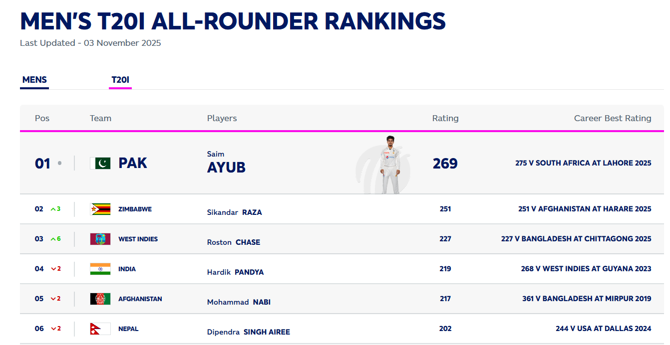 अलराउण्डर वरियताको शीर्ष स्थानमा पाकिस्तानका सायम अयुब कायमै छन् । दोस्रोमा सिकन्दर राजा, तेस्रोमा वेस्ट इन्डिजका रस्टन चेज उक्लँदा भारतका हार्दिक पान्ड्या चौथोमा र अफगानिस्तानका मोहम्मद नाबी पाँचौंमा झरेका छन् ।