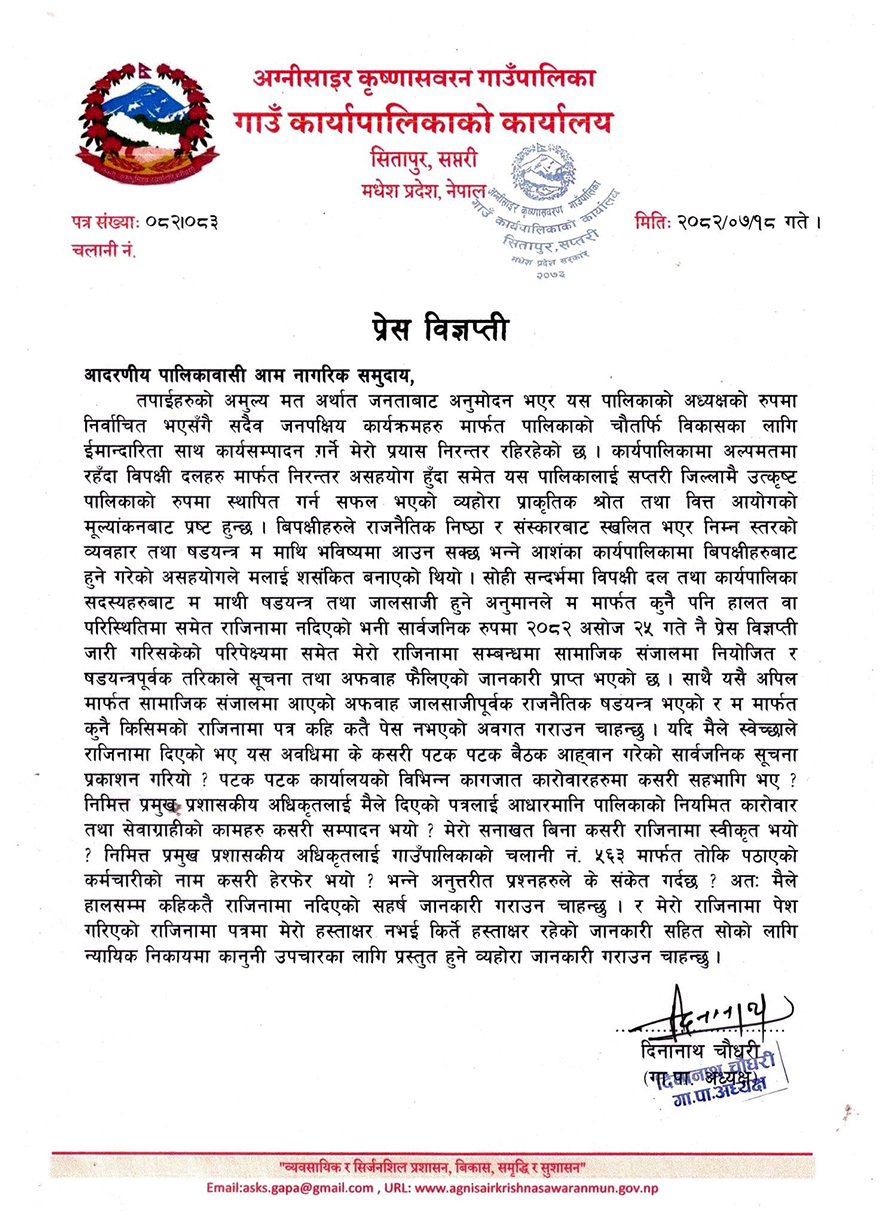 Generated by OK AI. Editorially reviewed.- सप्तरीको अग्नीसाइर कृष्णासवरन गाउँपालिकाका अध्यक्ष दिनानाथ चौधरीले आफूले कुनै पनि निकायमा राजीनामा नदिएको दाबी गरेका छन्।