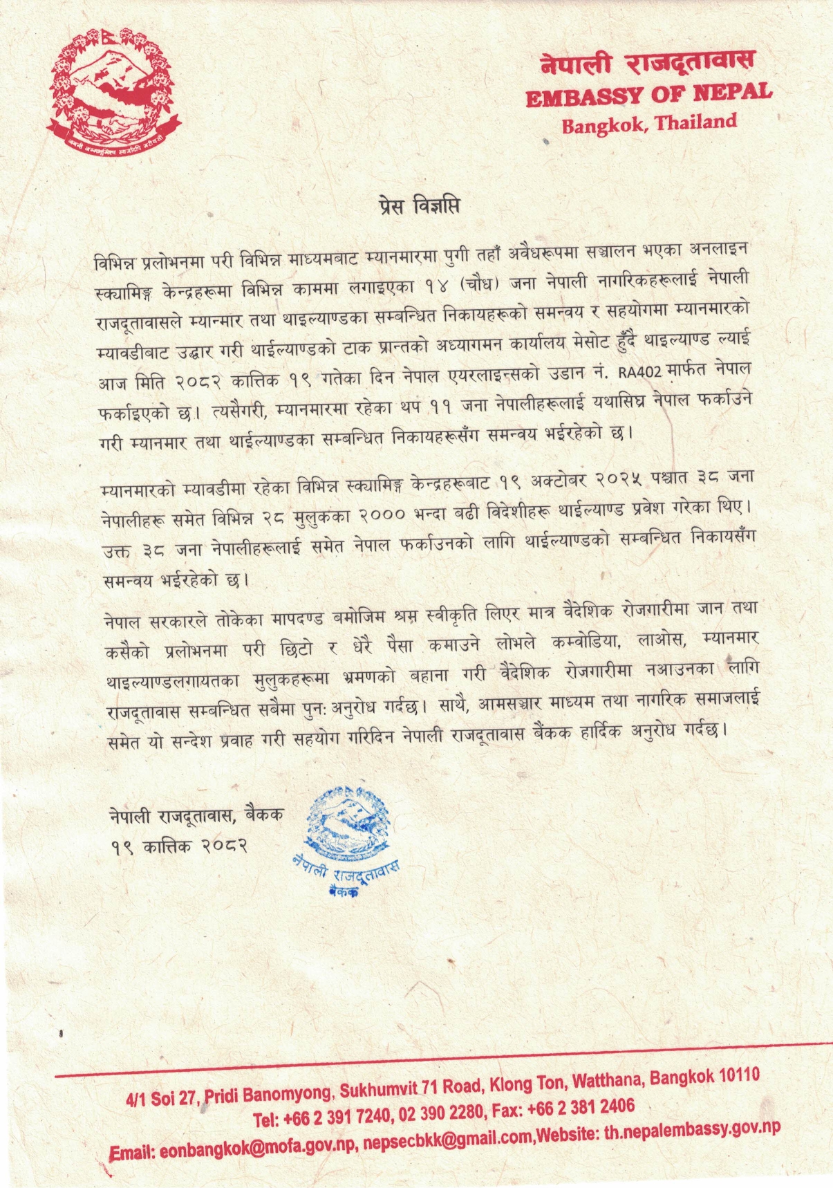 उनीहरूलाई म्यानमारको म्यावडीबाट उद्धार गरी थाइल्याण्डको टाक प्रान्तको अध्यागमन कार्यालय मेसोट हुँदै आज नेपाल पठाइएको थाइल्याण्डस्थित नेपाली राजदूतावासले जनाएको छ ।