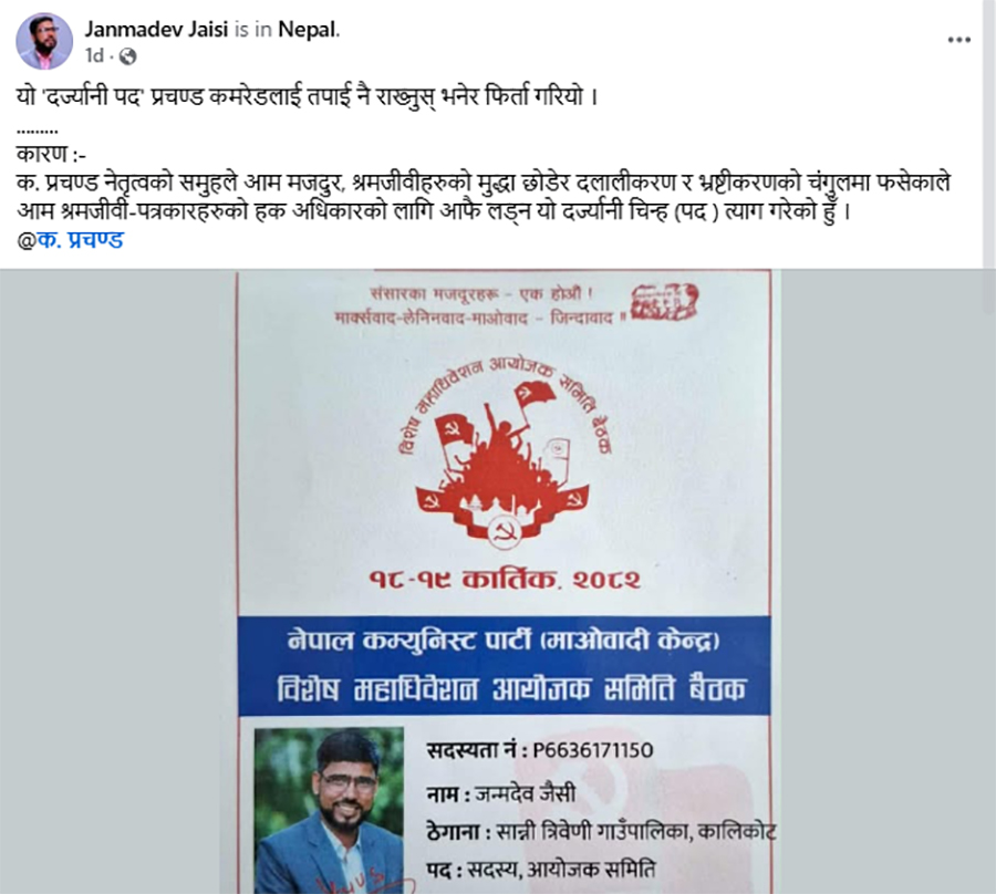 जनपक्षीय श्रमजीवी पत्रकारहरूको हकहितमा सक्रिय रहेका उनले बुधवार सामाजिक सञ्जाल फेसबुक मार्फत संयोजक प्रचण्डलाई सम्बोधन गर्दै भनेका छन्, ‘यो ‘दर्ज्यानी पद’ प्रचण्ड कमरेड तपाईं नै राख्नोस् भनेर फिर्ता गरियो ।’