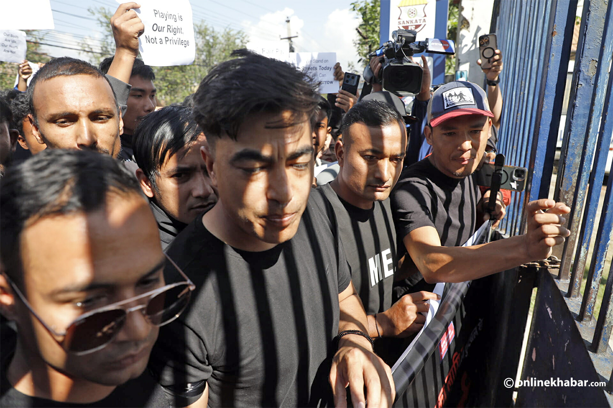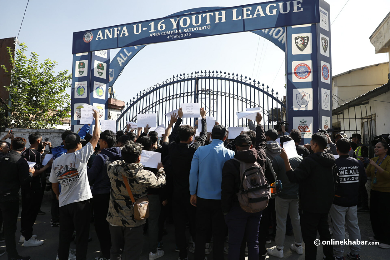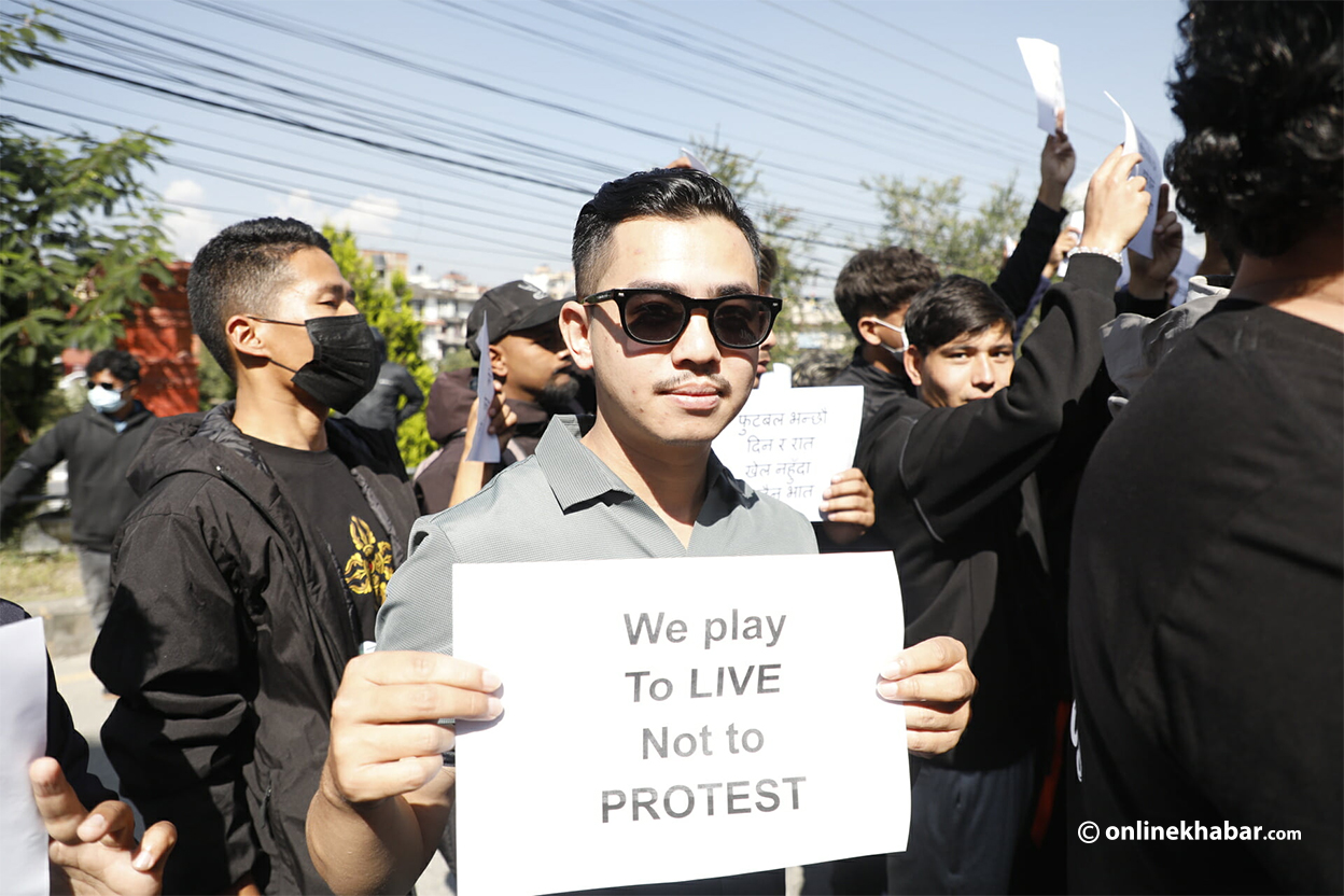 ए डिभिजन लिग यस वर्ष नगरी अर्को वर्ष मात्र गर्ने निर्णयविरुद्ध नेपाल फुटबल खेलाडी संघको आयोजनामा खेलाडीहरुले सातदोबाटोस्थित एन्फा मुख्यालय पुगरे प्रदर्शन गरेका हुन् ।