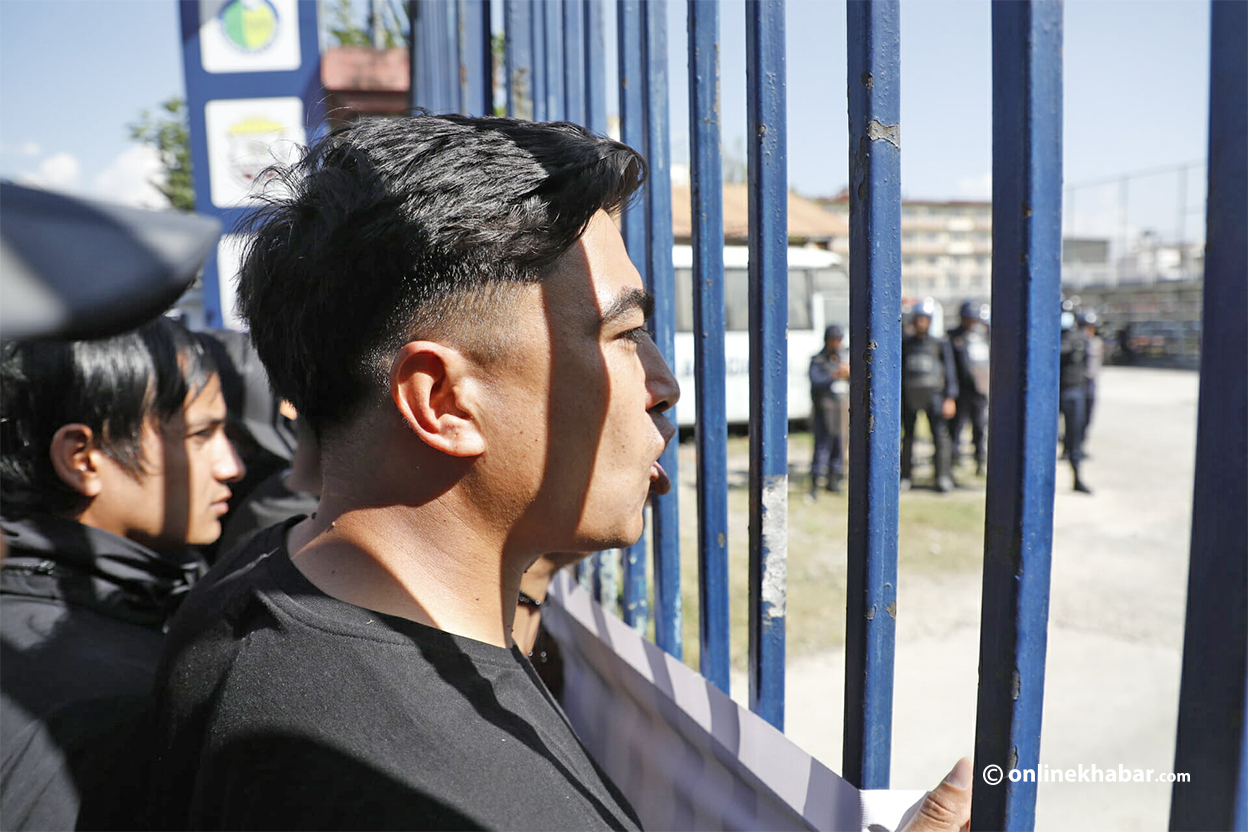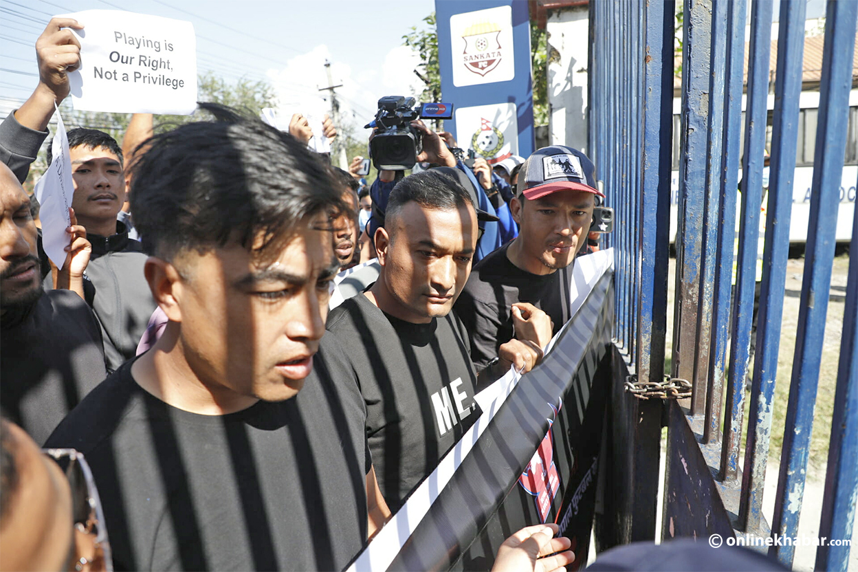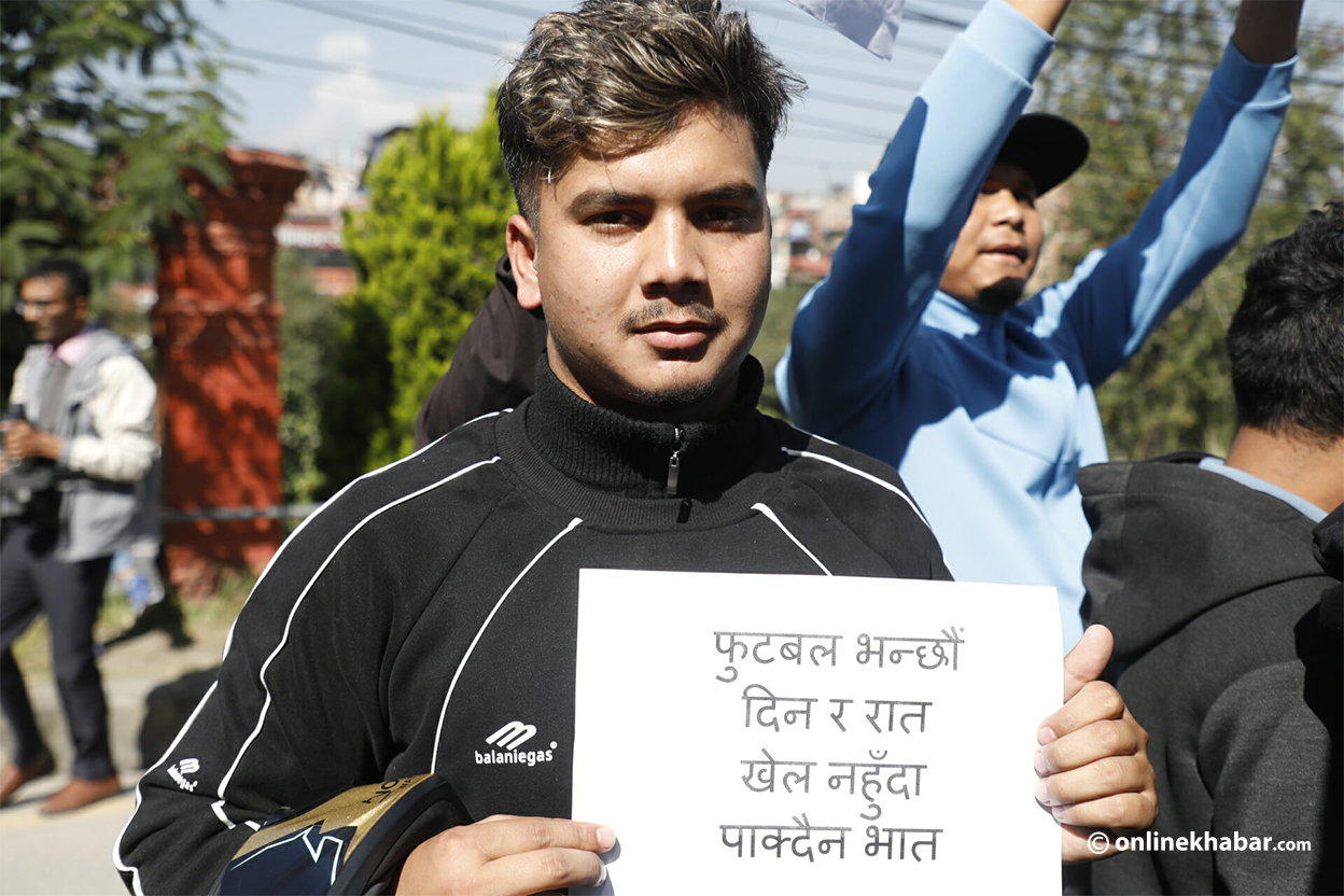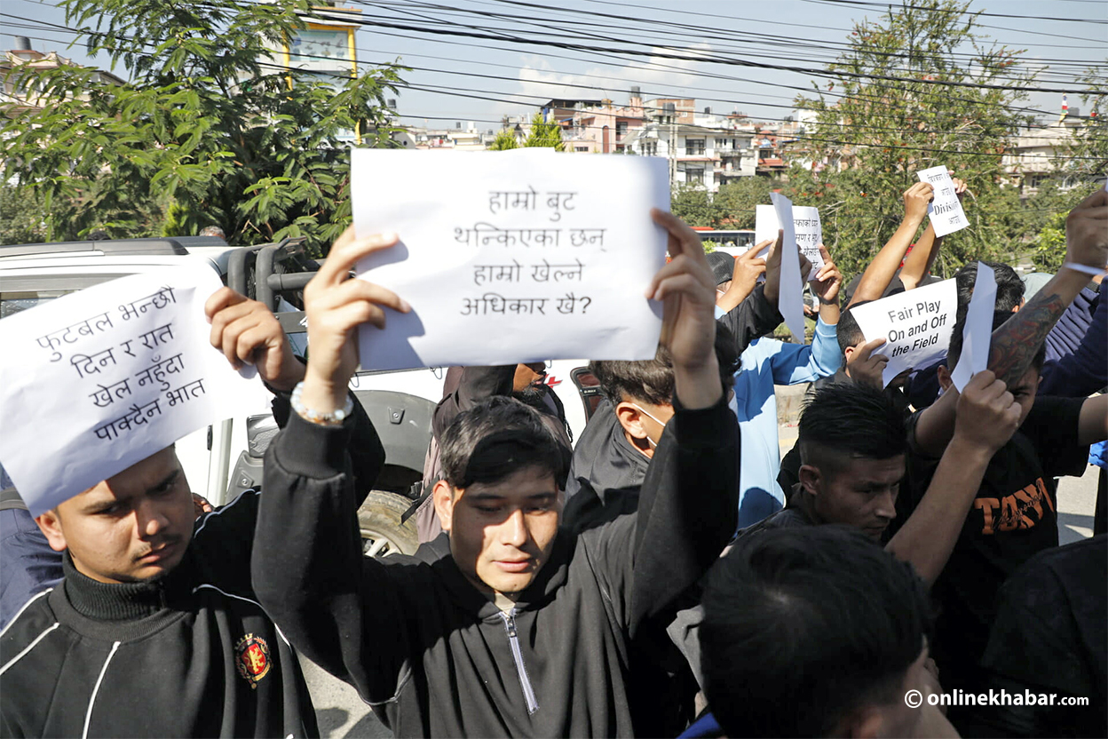 २० कात्तिक, काठमाडौं । खेलाडीहरूले अखिल नेपाल फुटबल संघ (एन्फा) मुख्यालयमा प्रदर्शन गरेका छन् ।
