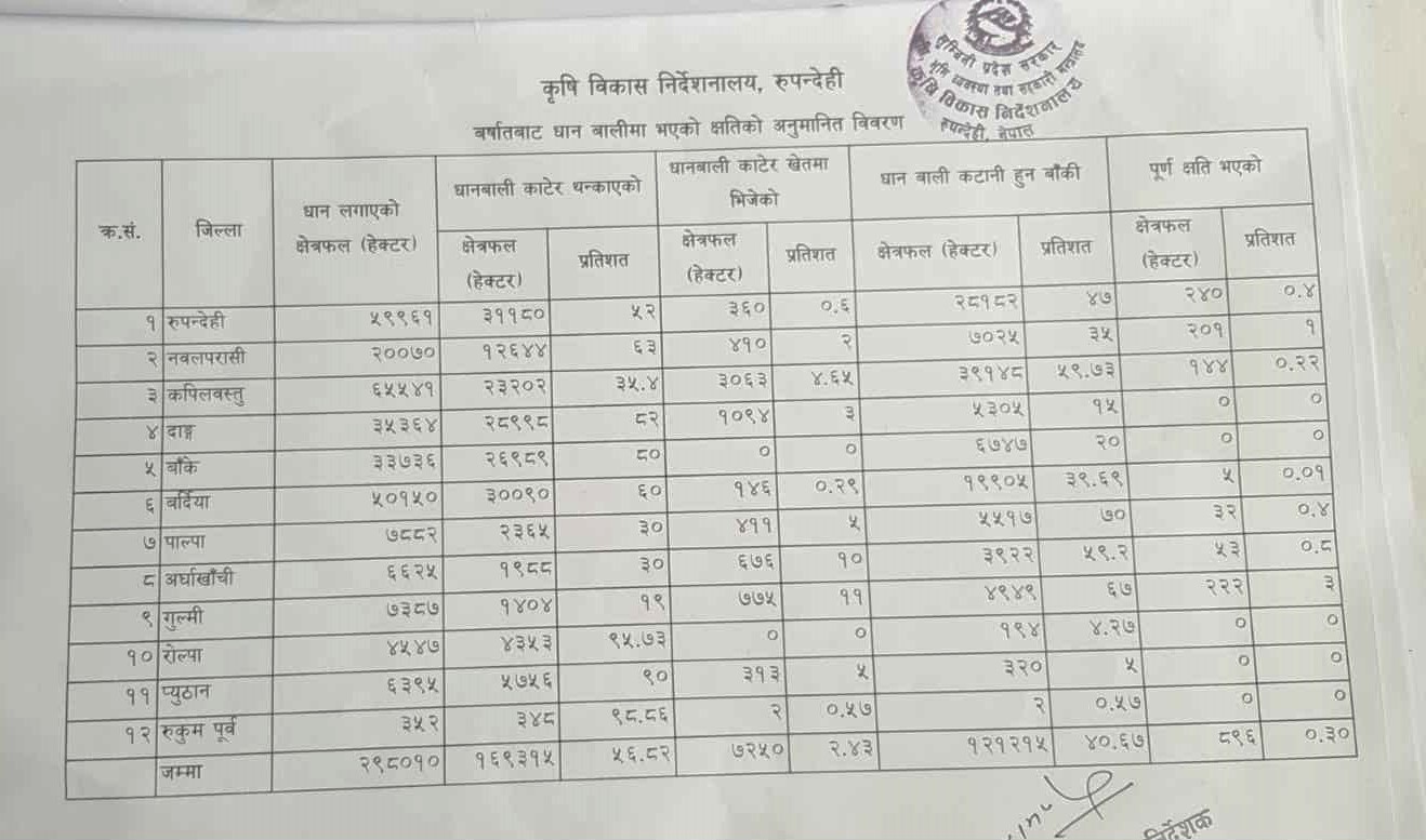 वर्षाले लुम्बिनीका १२ जिल्ला मध्ये ७ जिल्लाका ८९६ हेक्टरमा लगाइएको धानबाली क्षति भएको हो ।