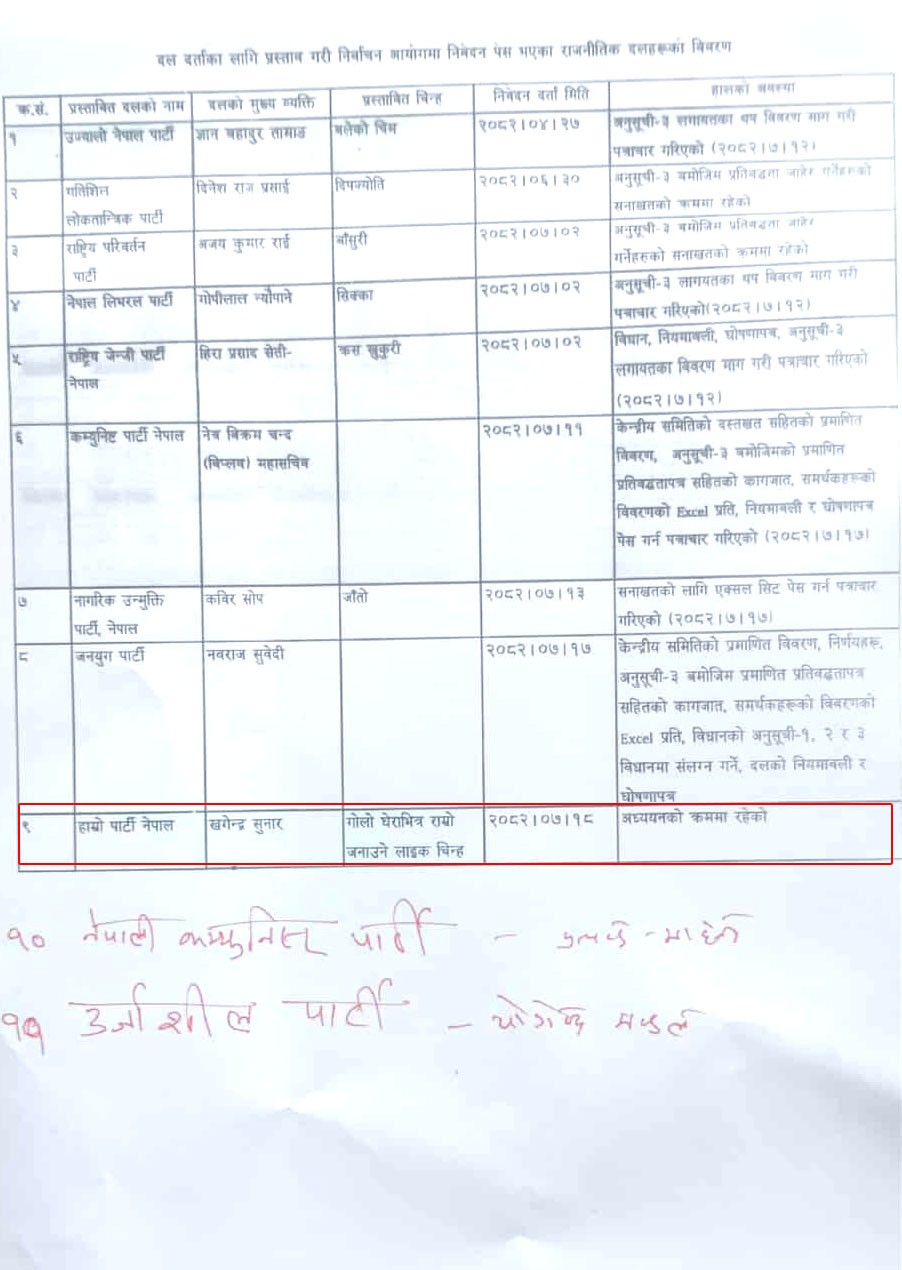 • अभियन्ता खगेन्द्र सुनारको सभापतित्वमा हाम्रो पार्टी नेपाल नामक दल दर्ताको निवेदन निर्वाचन आयोगमा पुगेको छ।