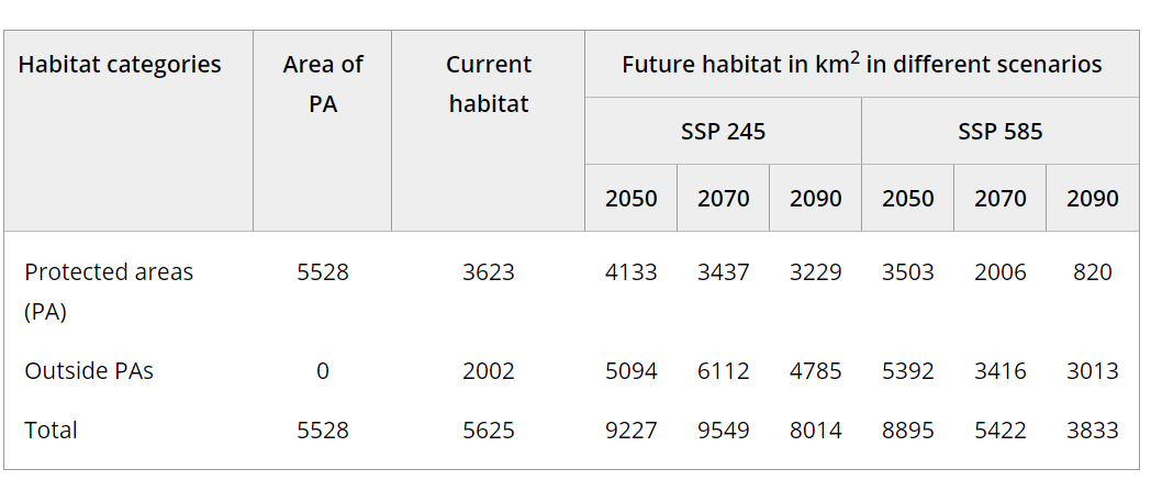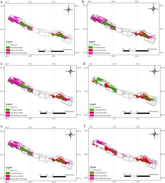 अध्ययनमा सामाजिक आर्थिक तथ प्रविधि विकास र जमिनको उपयोगमा हुने फेरबदललाई आधार मान्दै मेक्सेन्ट सफ्टवेयरको प्रयोग गरिएको थियो । एक दर्जन अनुसन्धानकर्ताको यो अनुसन्धानमा दुईवटा परिदृश्य एसएसपी २४५ (SSP245) र एसएसपी ५८५ (SSP 585) प्रयोग गरिएको छ । दुवै मोडललाई रन गराएर हेर्दा सन् २०५० सम्म दुवै अवस्थामा ८० प्रतिशतले बासस्थान बढ्ने देखिन्छ ।