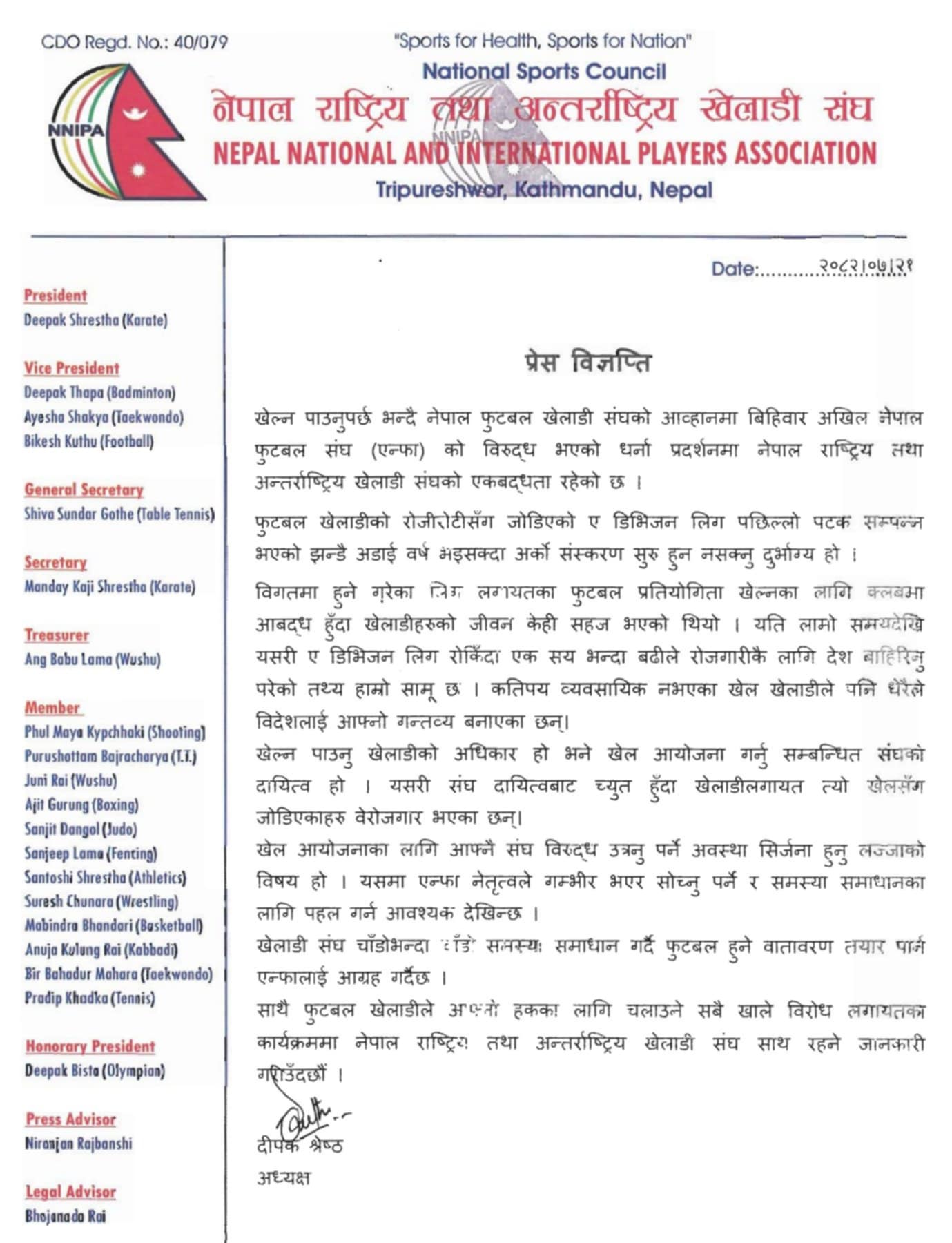 - नेपाल राष्ट्रिय तथा अन्तर्राष्ट्रिय खेलाडी संघले खेलाडी संघको मागलाई न्यायोचित ठहर गर्दै एन्फा नेतृत्वलाई समस्या समाधान गर्न गम्भीर पहल गर्न आग्रह गरेको छ।