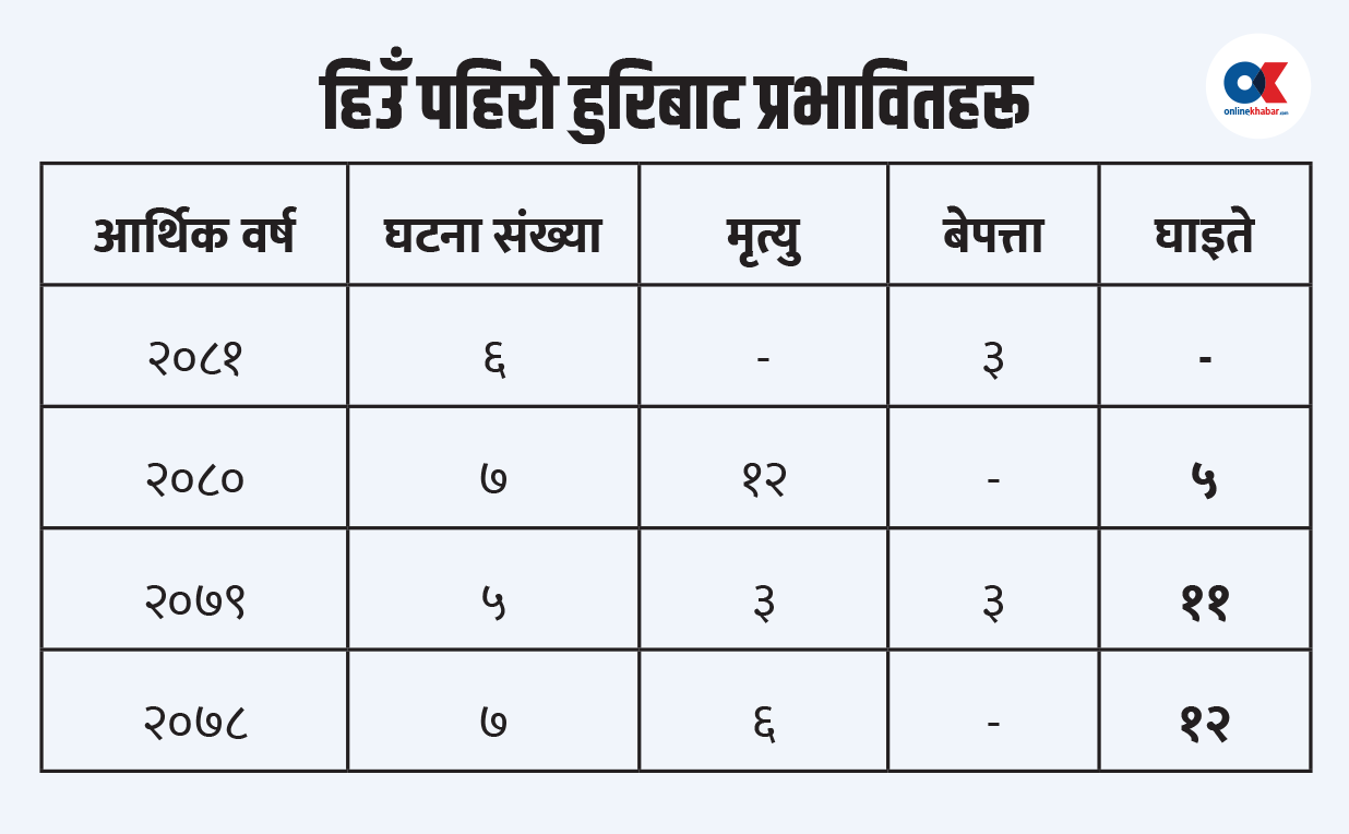राष्ट्रिय विपद् जोखिम न्यूनीकरण तथा व्यवस्थापन प्राधिकरणका अनुसार आर्थिक वर्ष २०८१ मा हिउँ पहिरोका ६ वटा घटना भएका थिए, जसमा ३ जना बेपत्ता भए । त्यसैगरी आर्थिक वर्ष २०८० मा ७ वटा घटना भएकोमा १२ जनाको मृत्यु भयो । ५ जना घाइते भए ।