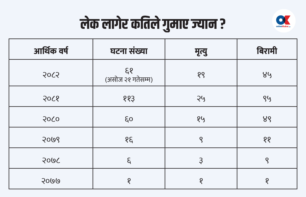 प्राधिकरणका अनुसार चालु अर्थिक वर्ष २०८२/०८३ को ६ महिनाको अवधिमा मात्र लेक लागेर १९ जनाको मृत्यु भएको छ । २०८२ वैशाखदेखि असोज २१ सम्म ६१ वटा लेक लागेका घटना भए । जसमा १९ जनाको मृत्यु भएको छ भने ४५ जना बिरामी भएका छन् ।