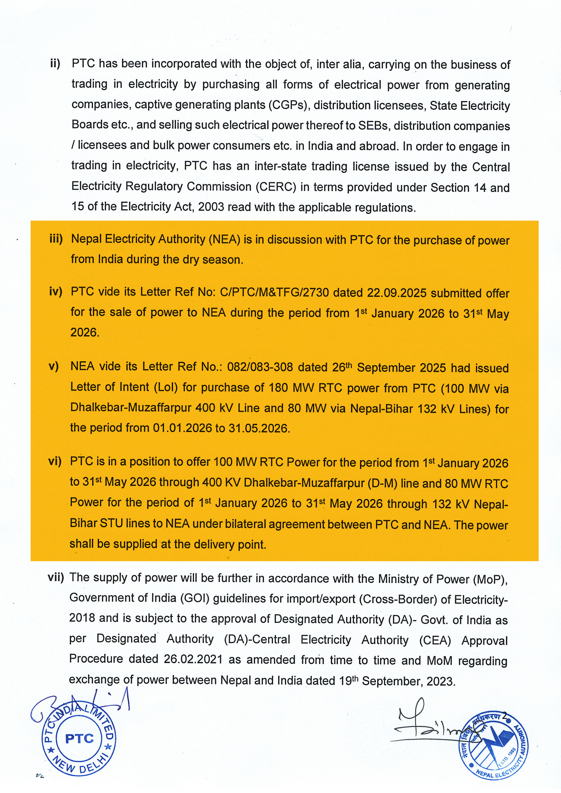 ८ अगस्टमा पीटीसीले बिहारको १३२ केभी बिन्दुबाट प्रतियुनिट ६.७४ भारु दरमा विद्युत् बिक्री गर्ने प्रस्ताव गरेको र त्यो भारतमा तत्काल प्रचलित खरिद–बिक्रीदर भन्दा केही बढी देखेर खरिद सम्झौता गर्नुअघि मूल्य घटाउन एक पटक अनुरोध गर्ने निर्णय भई मूल्य केही कम गर्न पत्राचार समेत भएको प्राधिकरण स्रोतले पनि पुष्टि गर्यो ।