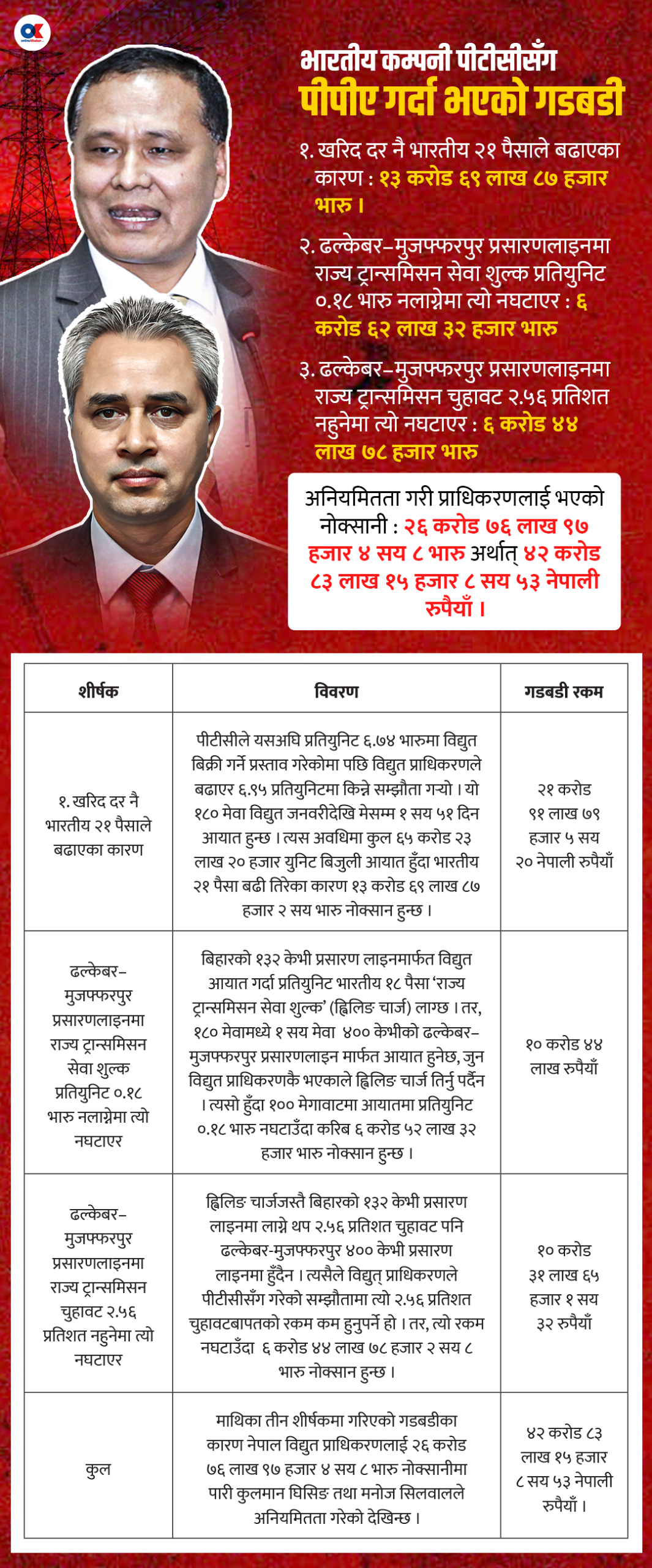 Generated by OK AI. Editorially reviewed.- ऊर्जा मन्त्री कुलमान घिसिङ र विद्युत् प्राधिकरणका निर्देशक मनोज सिलवालले भारतीय कम्पनी पीटीसीसँग बढी दरमा विद्युत् खरिद सम्झौता गरेर करिब ४३ करोड घाटा पुर्याएको कागजातले देखाएको छ।