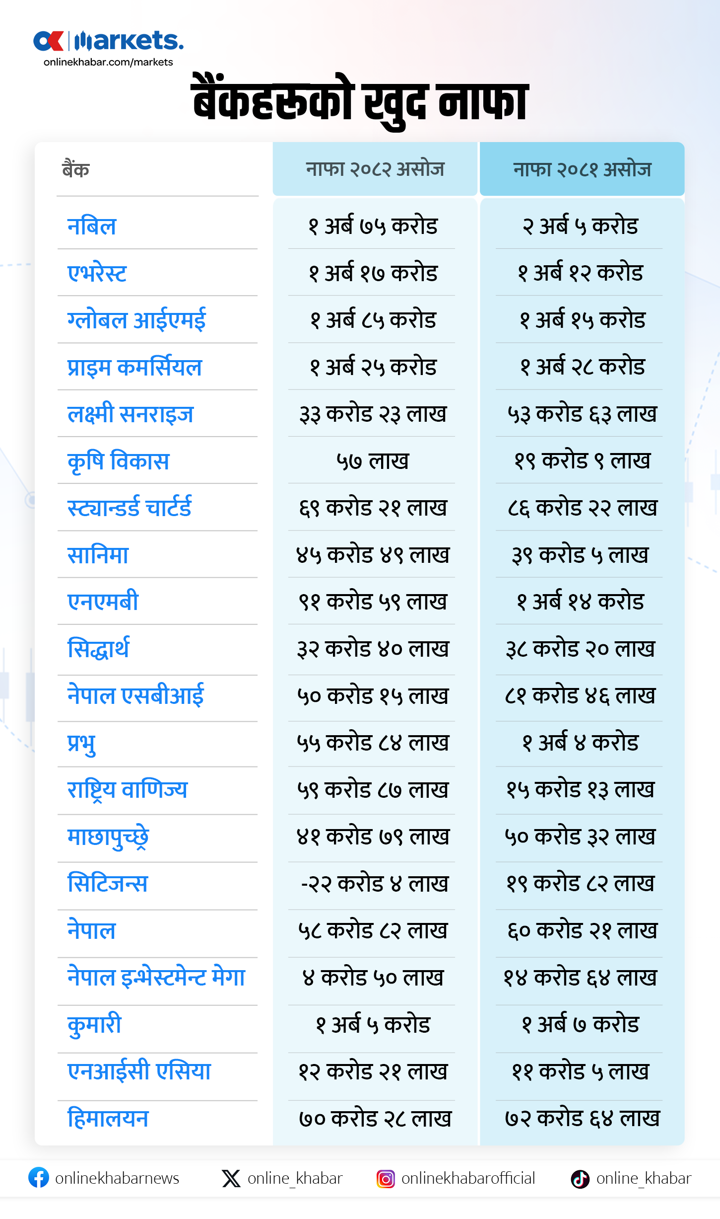 Generated by OK AI. Editorially reviewed.- चालु आर्थिक वर्षको पहिलो त्रैमासमा वाणिज्य बैंकहरूको नाफा करिब १९ प्रतिशतले घटेको छ।