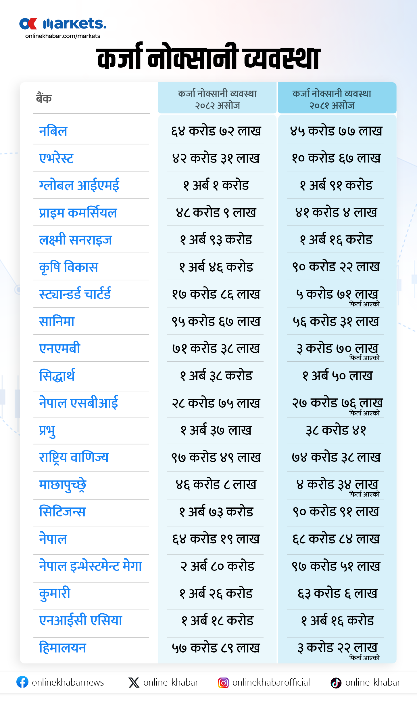 गत आर्थिक वर्षमा कर्जा नोक्सानी व्यवस्थाबाट ५ बैंकले रकम फिर्ता गरेको भएपनि चालु आवमा सबै बैंकहरूले बढाएर कर्जा नोक्सानी व्यवस्था बापतको रकम राखेका छन् (तथ्याङकमा कर्जा नोक्सानी कोलममा राखिएको माइनस चिन्हले फिर्ता भएको रकम जनाउँछ)।