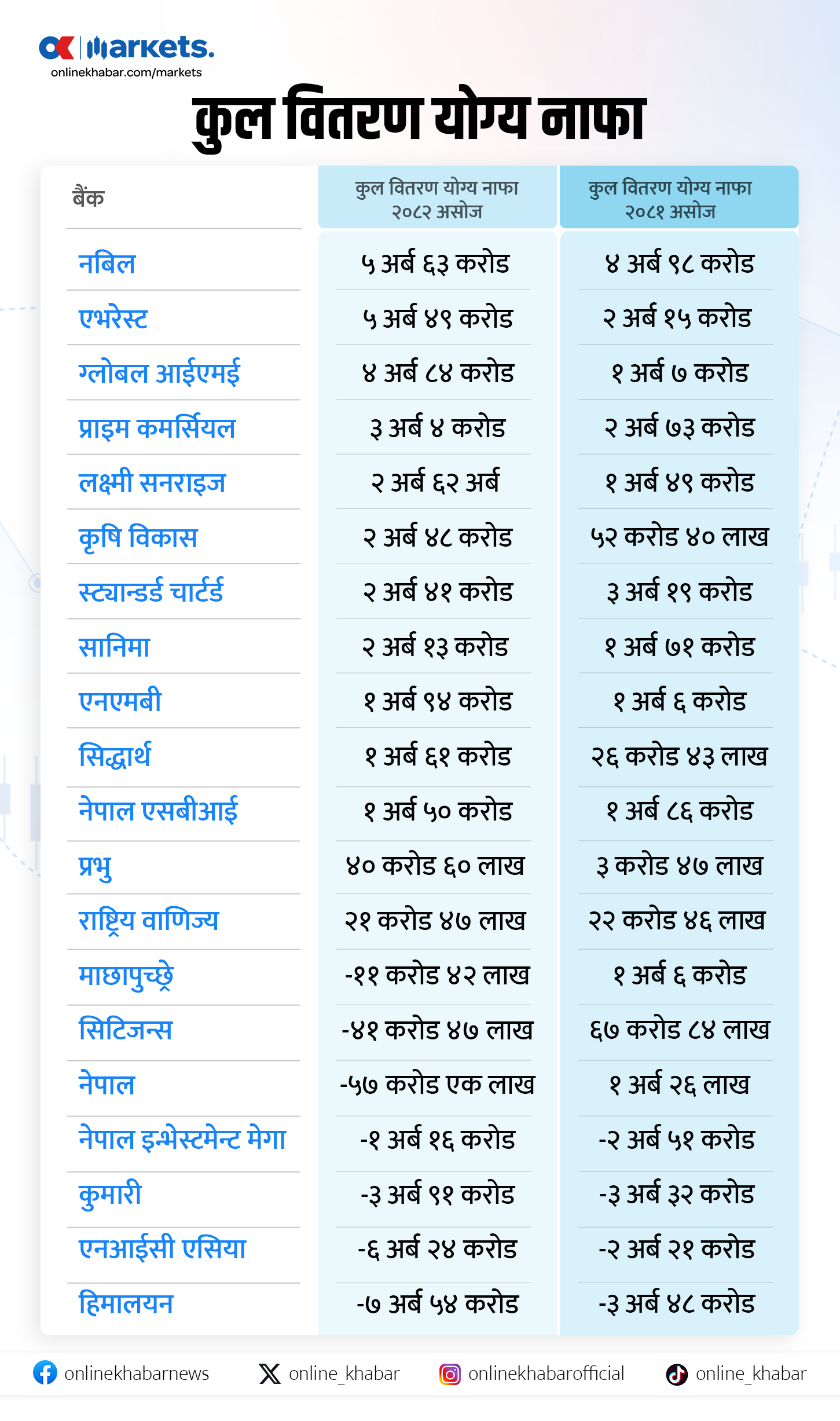 चालु आवको पहिलो त्रैमासमा नबिल बैंकको सबैभन्दा धेरै वितरणयोग्य नाफा रहेको छ । सो अवधिमा बैंकको कुल वितरण योग्य नाफा ५ अर्ब ६३ करोड रुपैयाँ रहेको छ । दोस्रो स्थानमा भने एभरेष्ट बैंक रहेको छ । एभरेष्टको कुल वितरण योग्य नाफा ५ अर्ब ४९ करोड रुपैयाँ छ ।