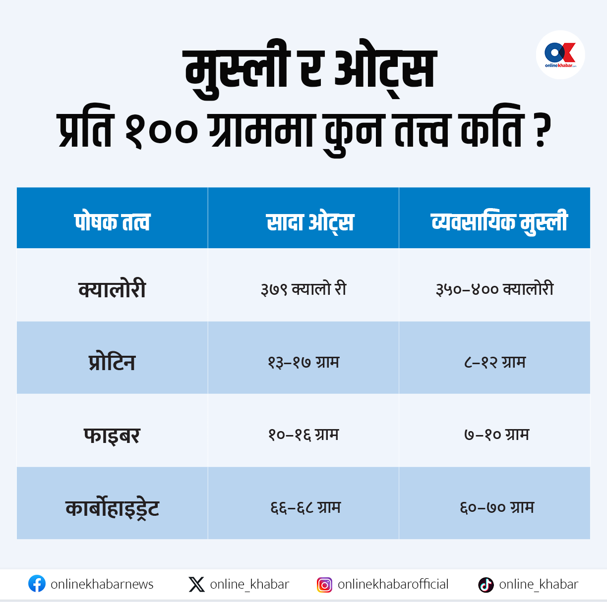 Generated by OK AI. Editorially reviewed.- ओट्स पूर्णअन्न हुन् जसमा फाइबर, प्रोटिन र एन्टिअक्सिडेन्ट उच्च मात्रामा हुन्छन् र कोलेस्टेरोल तथा रक्तचाप नियन्त्रणमा मद्दत गर्छन्।